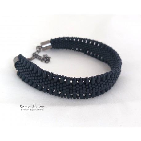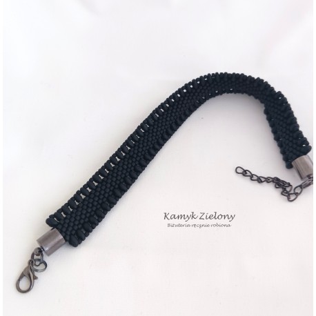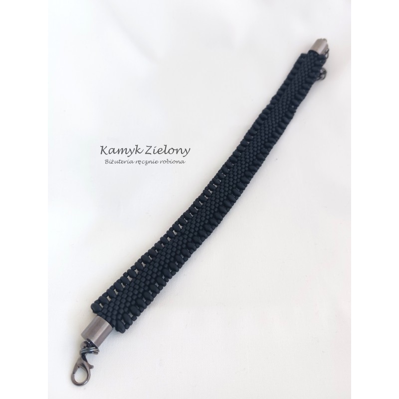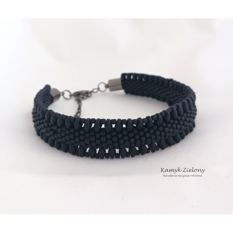 Bransoletka została zrobiona ręcznie ze szklanych koralików Toho w kolorze matowej czerni oraz z czarnych, błyszczących koralików SuperDuo.