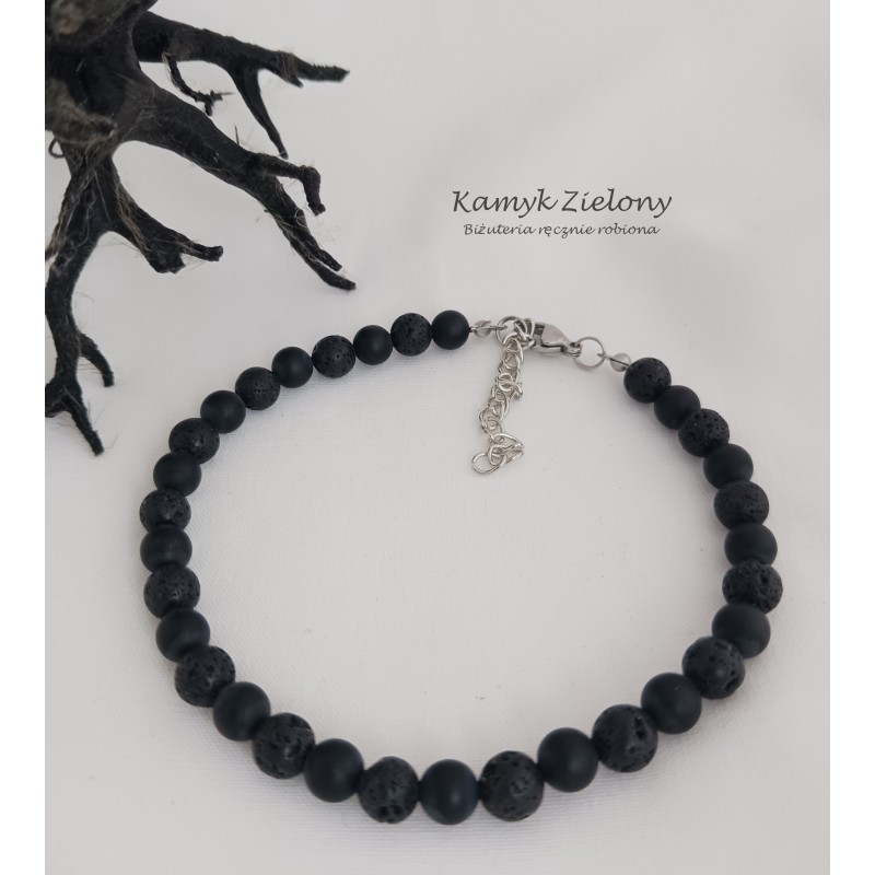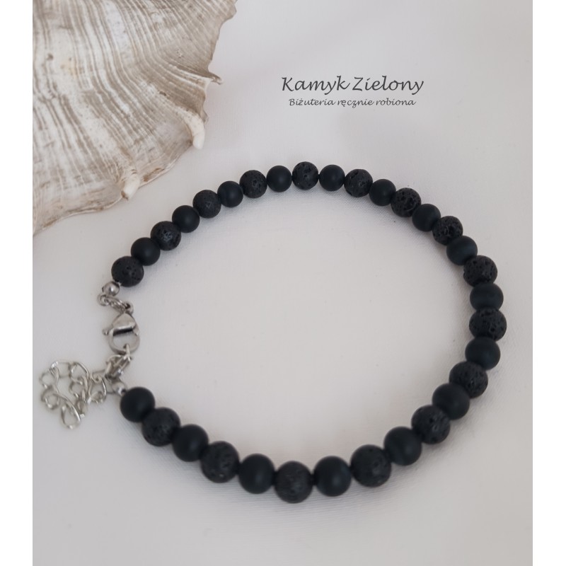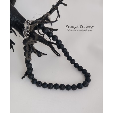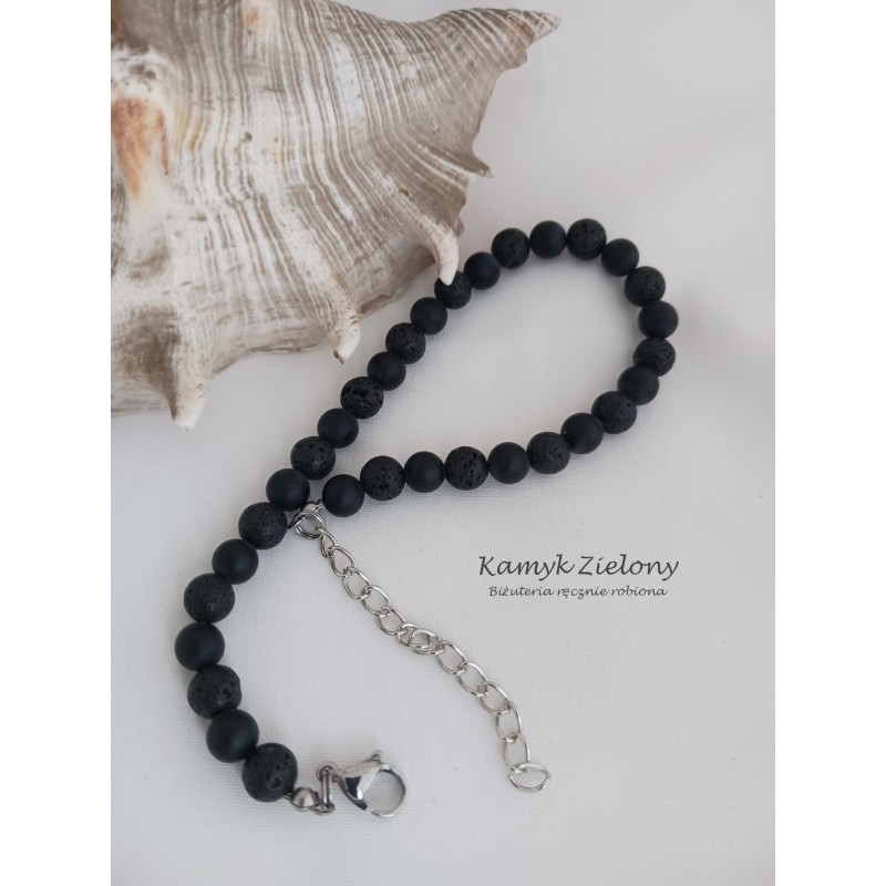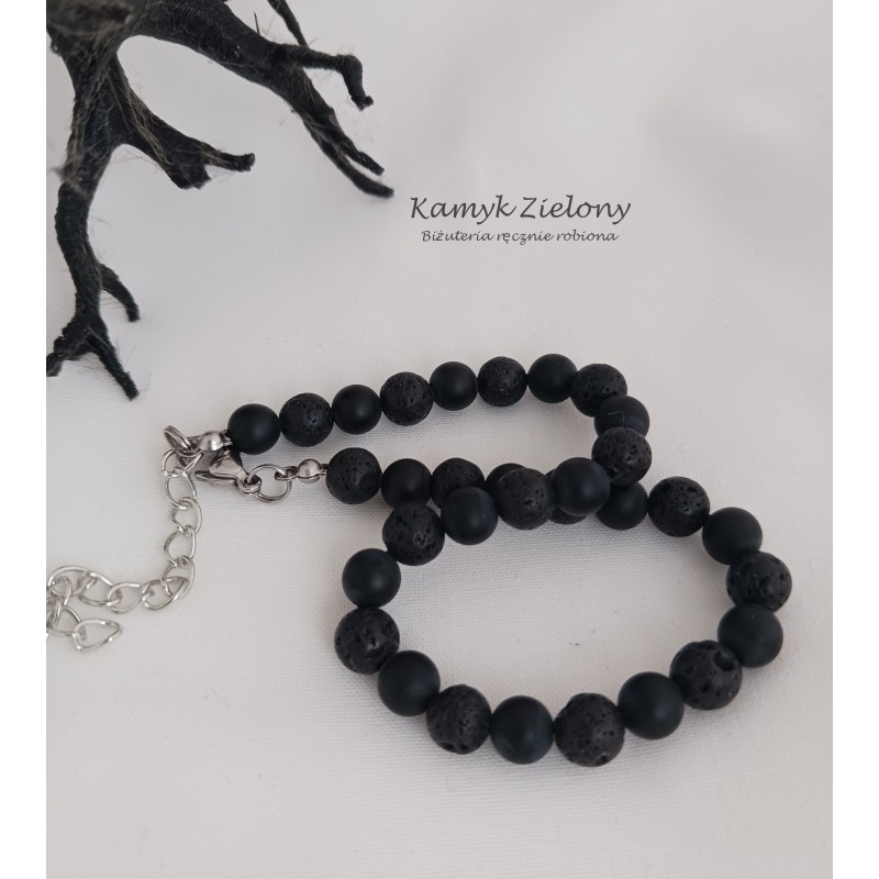 Bransoletka wykonana z kulek czarnej lawy wulkanicznej o charakterystycznej, porowatej strukturze.