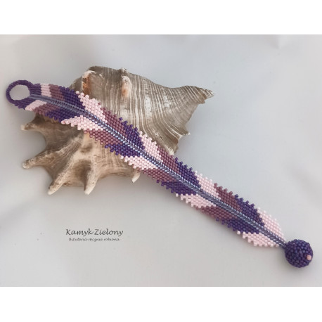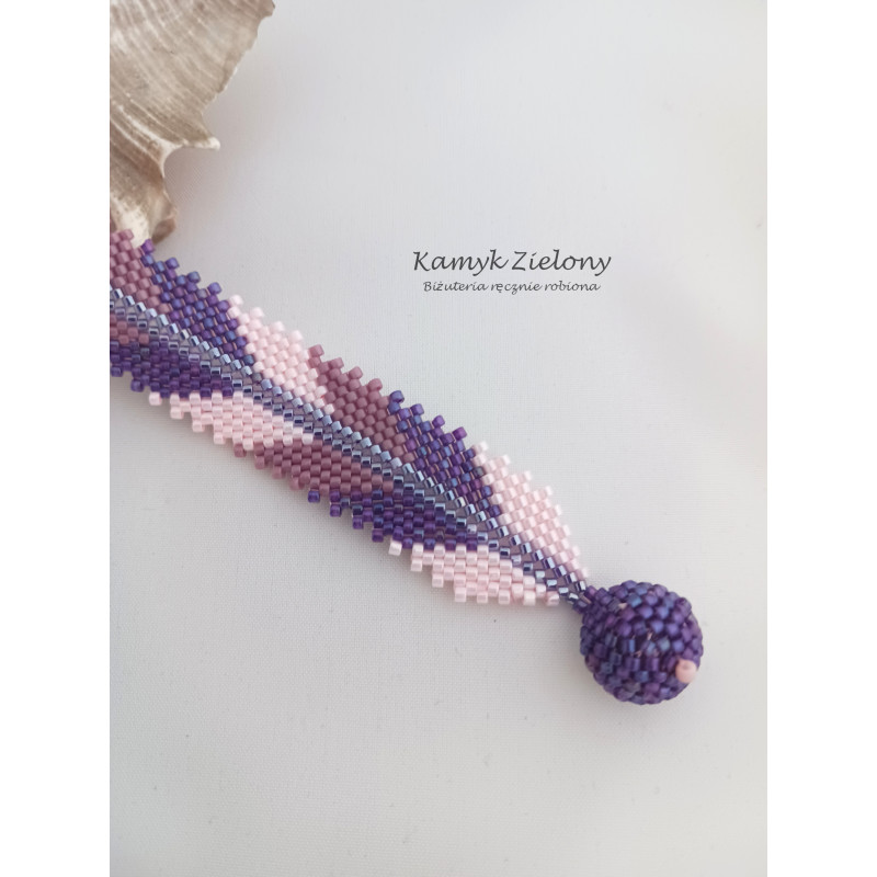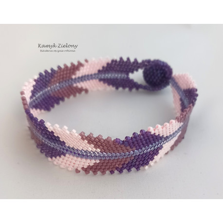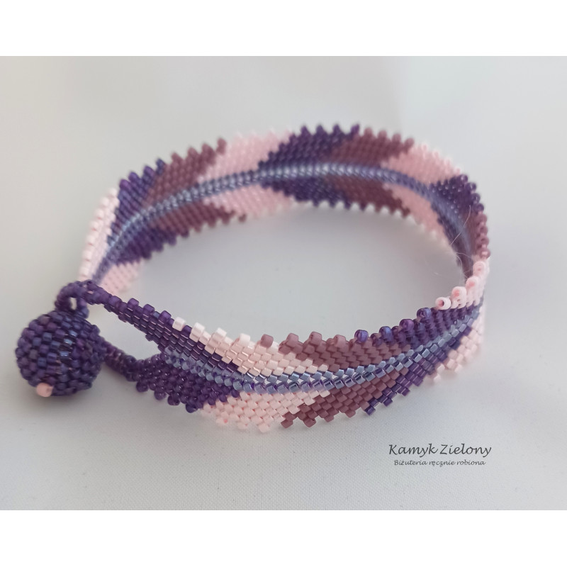 Bransoletka uszyta ręcznie z wysokiej jakości cylindrycznych koralików Toho (Toho Treasure), utrzymana w fioletowo-różowej kolorystyce.