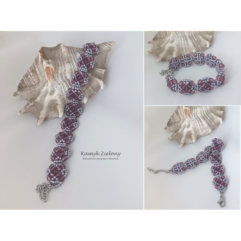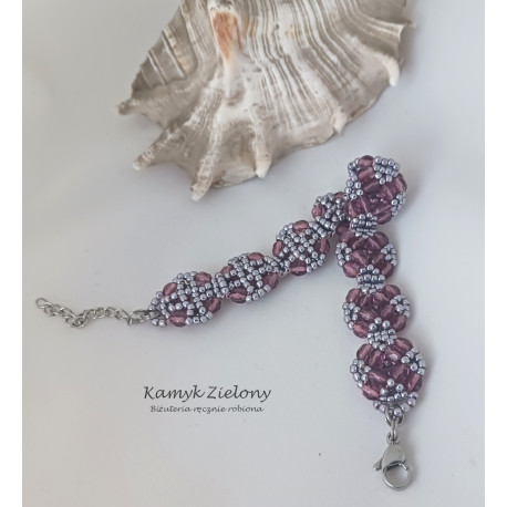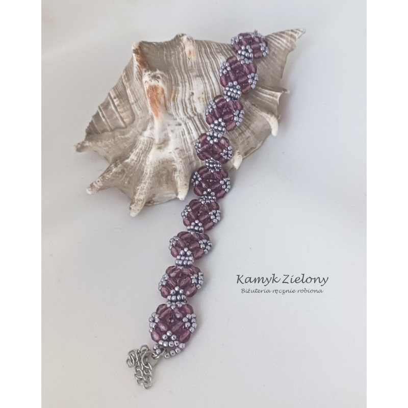 Bransoletka uszyta ręcznie ze szklanych koralików Toho w kolorze srebrnym o fioletowym odcieniu oraz z transparentnych, fioletowych kryształków Fire Polish.