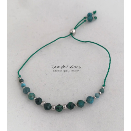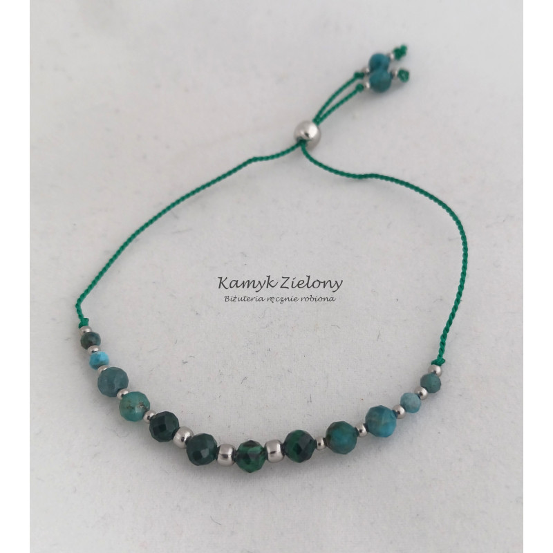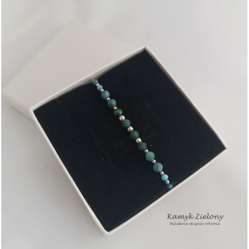 Subtelna bransoletka z kamieni naturalnych. W centralnej jej części umieszczono fasetowane kuleczki malachitu w pięknym, ciemnozielonym odcieniu, a po bokach kulki apatytu o dwóch wielkościach. Dodatkowo, jako przekładki, zastosowano drobniutkie kuleczki ze stali chirurgicznej.