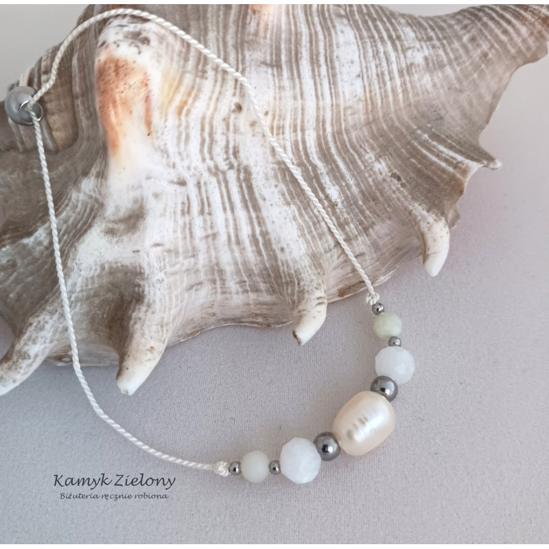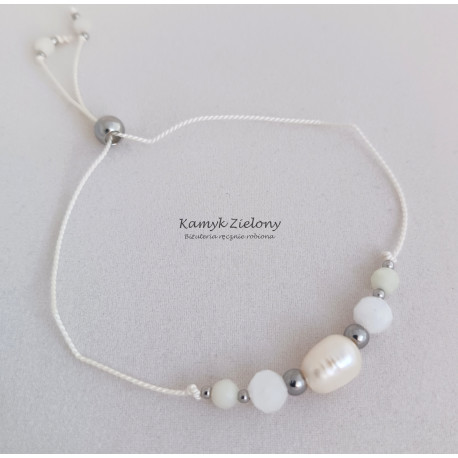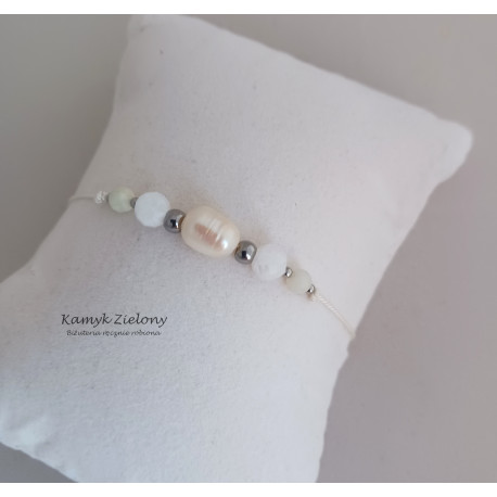 Bransoletka na jedwabnym sznureczku, wykonana z perły słodkowodnej oraz kuleczek morganitu w beżowo-białym kolorze oraz elementów ze stali szlachetnej.