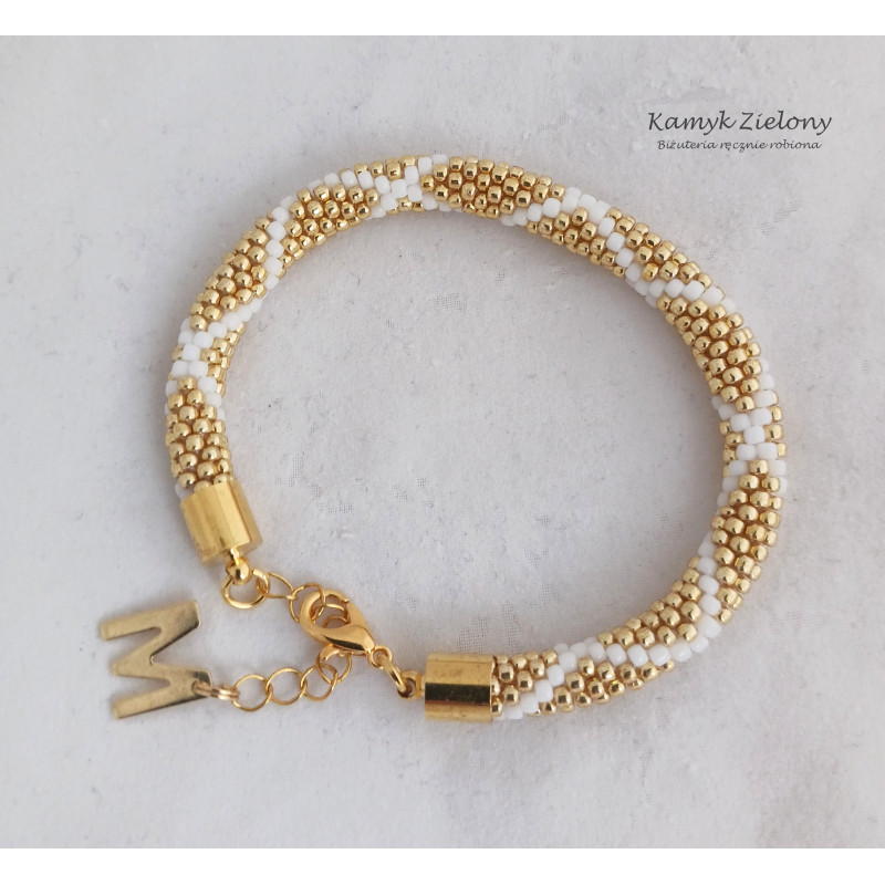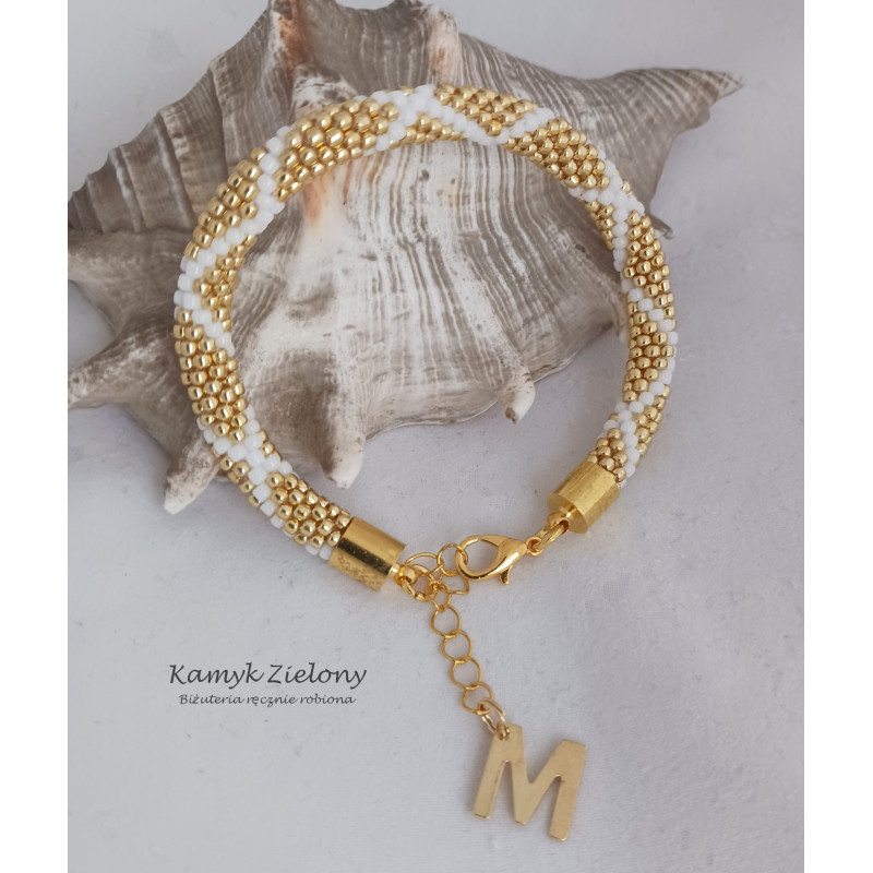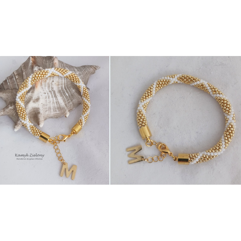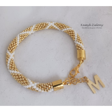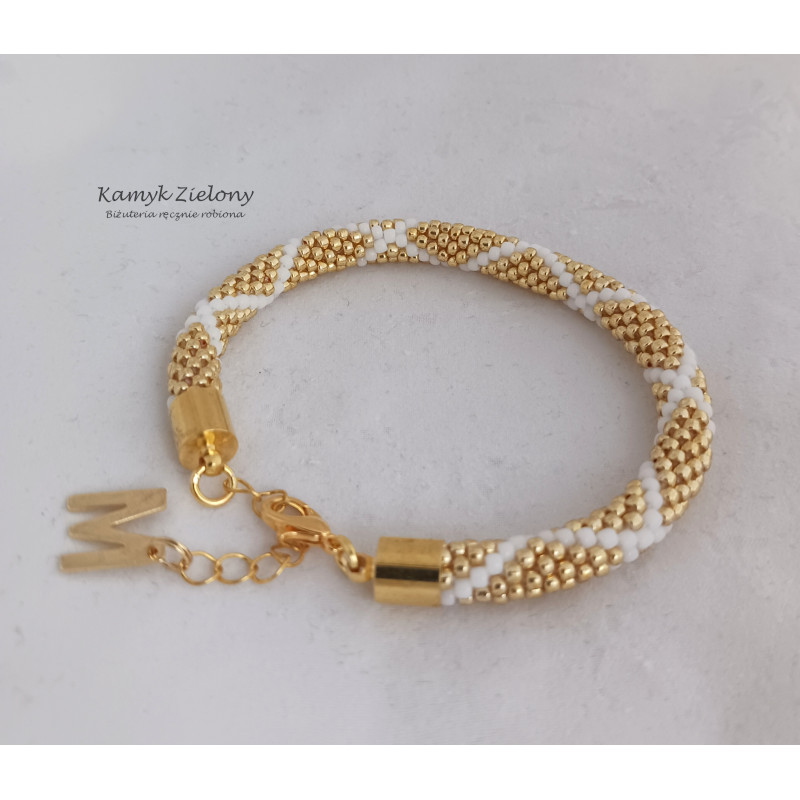 Bransoletka wykonana z japońskich koralików Toho w złotym kolorze, z wzorkiem w białą krateczkę.