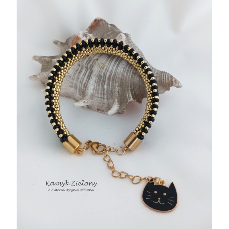 Uroku bransoletce dodaje stalowa czarno-złota zawieszka w kształcie kotka.