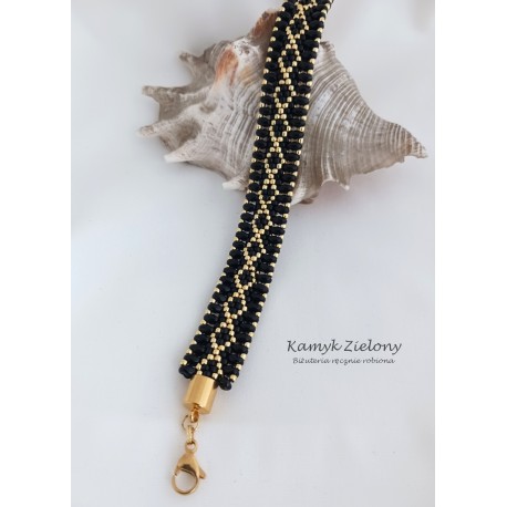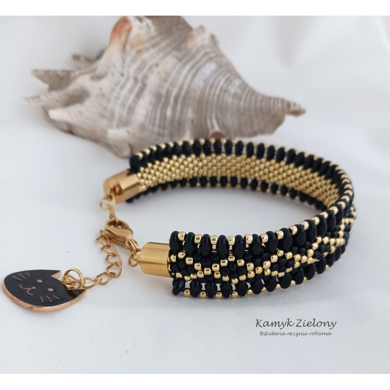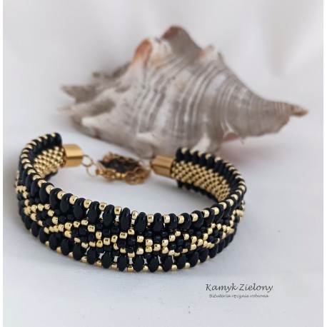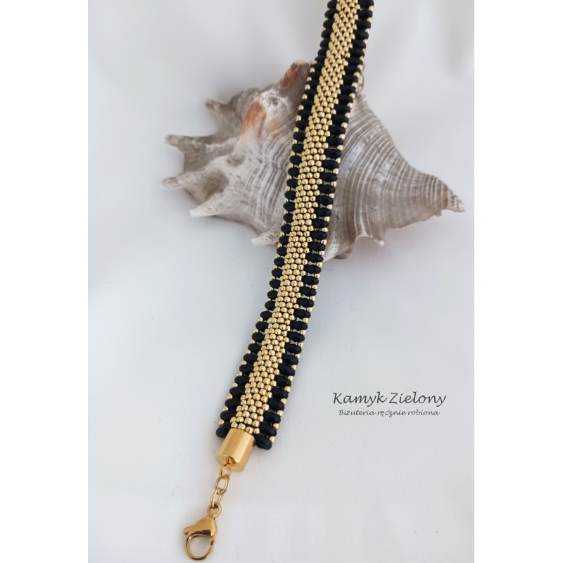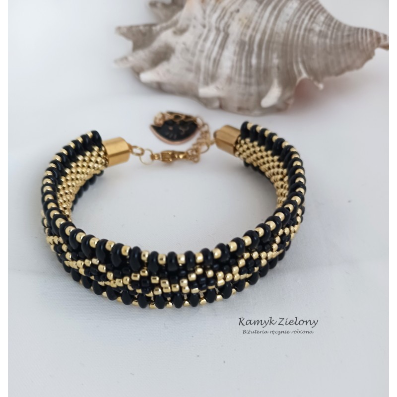 Bransoletka typu "gąsieniczka" wykonana ręcznie ze szklanych, japońskich koralików Toho w czarnym i złotym kolorze oraz dwudziurkowych czarnych koralików SuperDuo (koraliki na brzegach bransoletki).