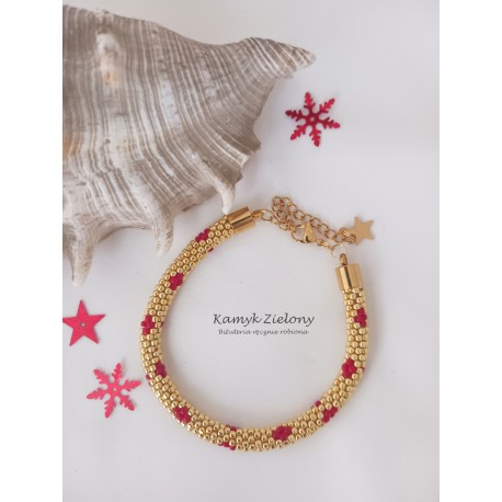 Bransoletka zrobiona została ręcznie z wysokiej jakości koralików Toho - doskonałych koralików szklanych, wyprodukowanych w Japonii. Koraliki w złotym kolorze posiadają trwałą warstwę koloru, który został naniesiony w procesie produkcji metodą galwanizowania. Zapewnia to wyjątkową wytrzymałość koloru koralików, który nie ściera się ani nie ulega odbarwieniu w trakcie użytkowania i przechowywania biżuterii.