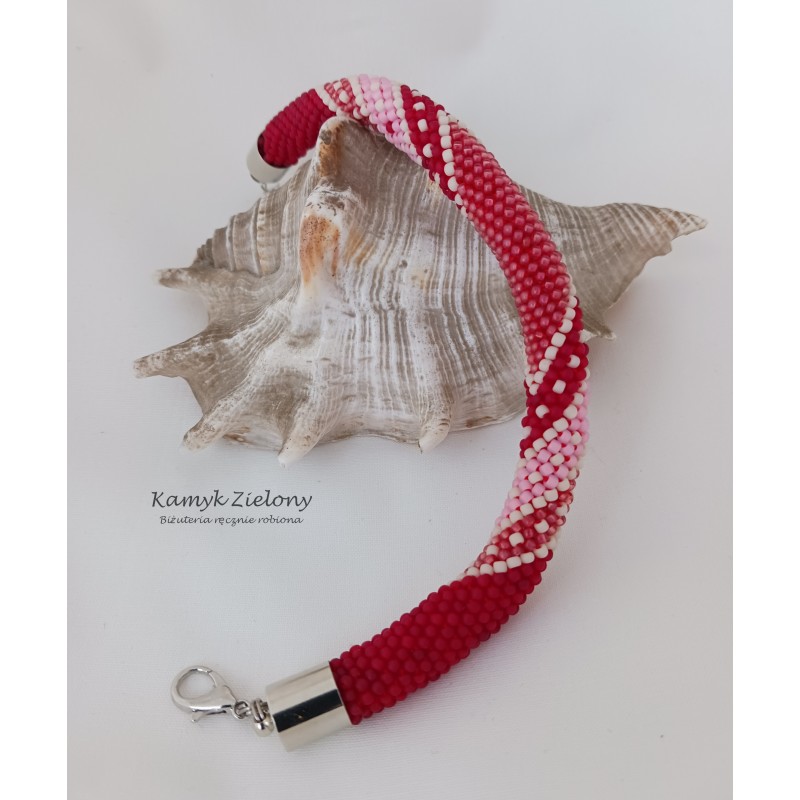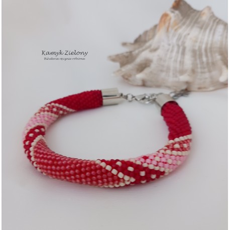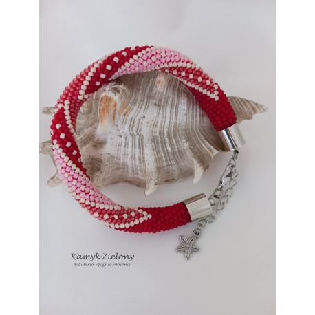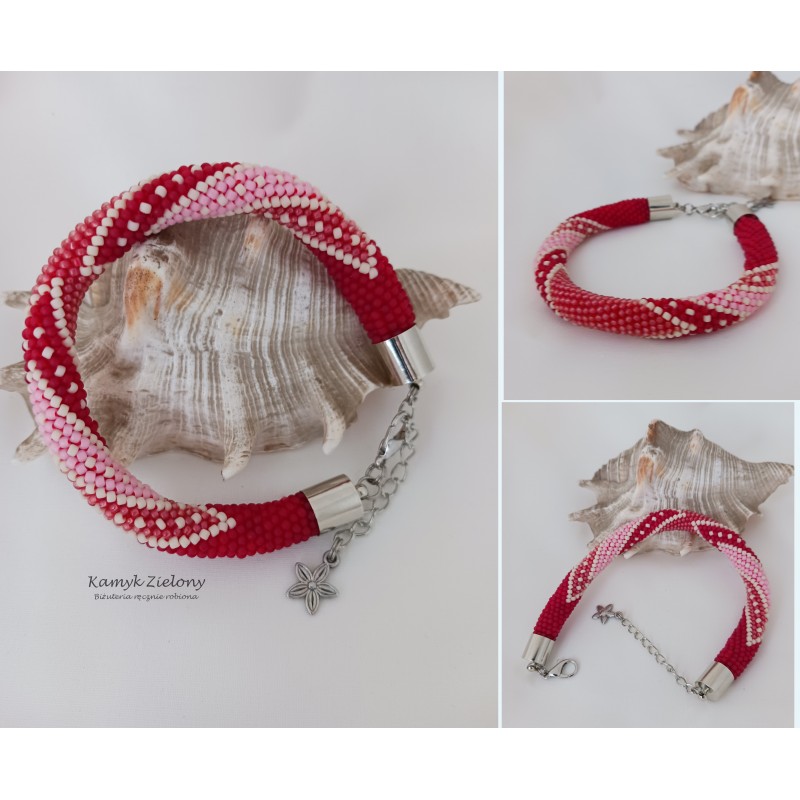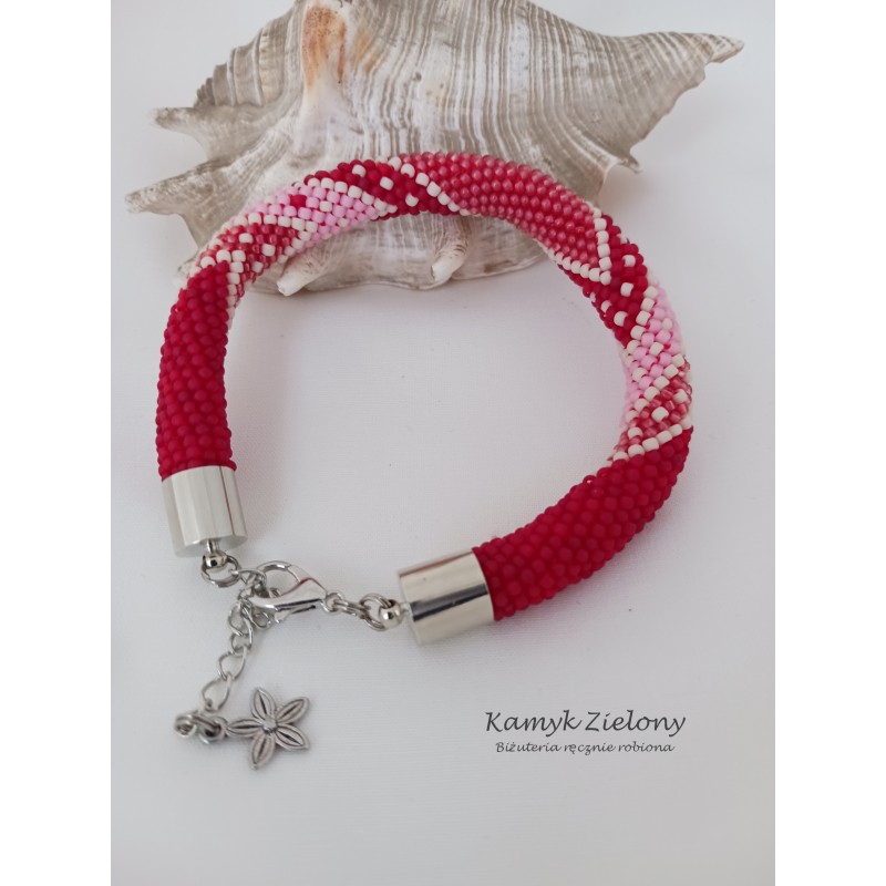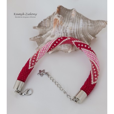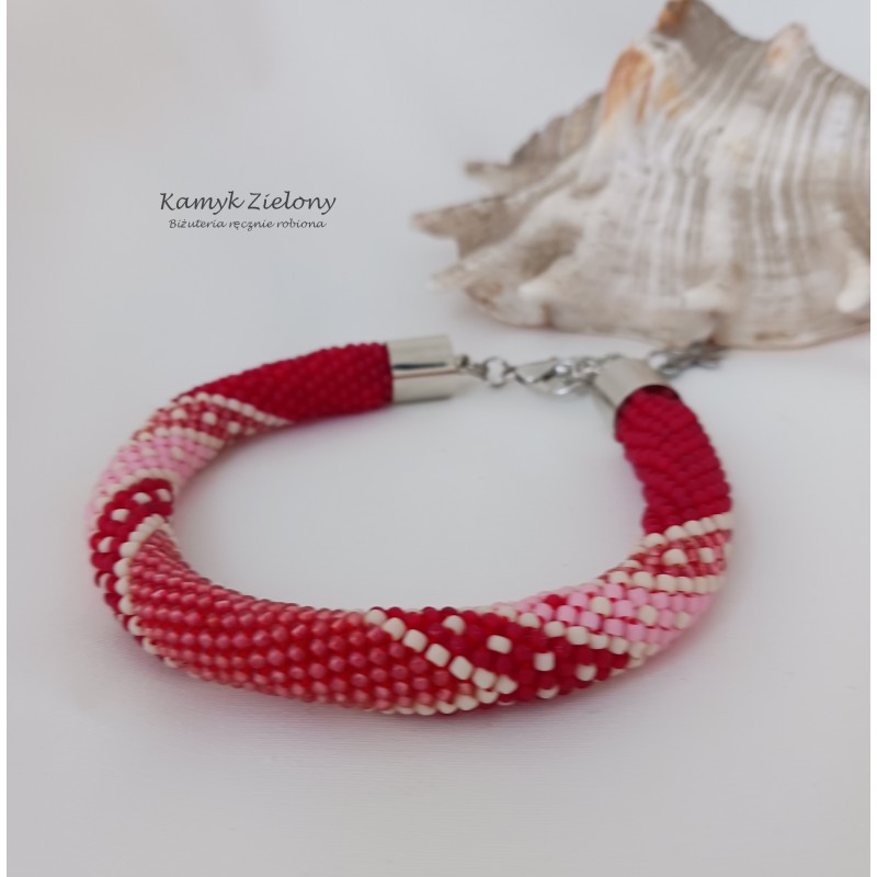 Ręcznie wykonana bransoletka, utrzymana w czerwono-różowej kolorystyce.