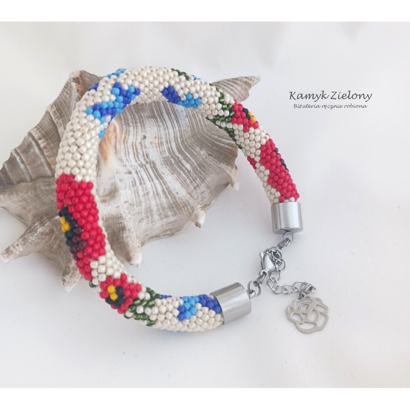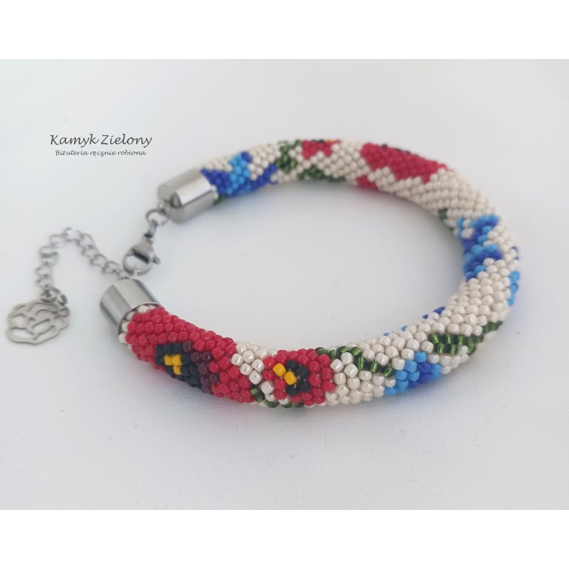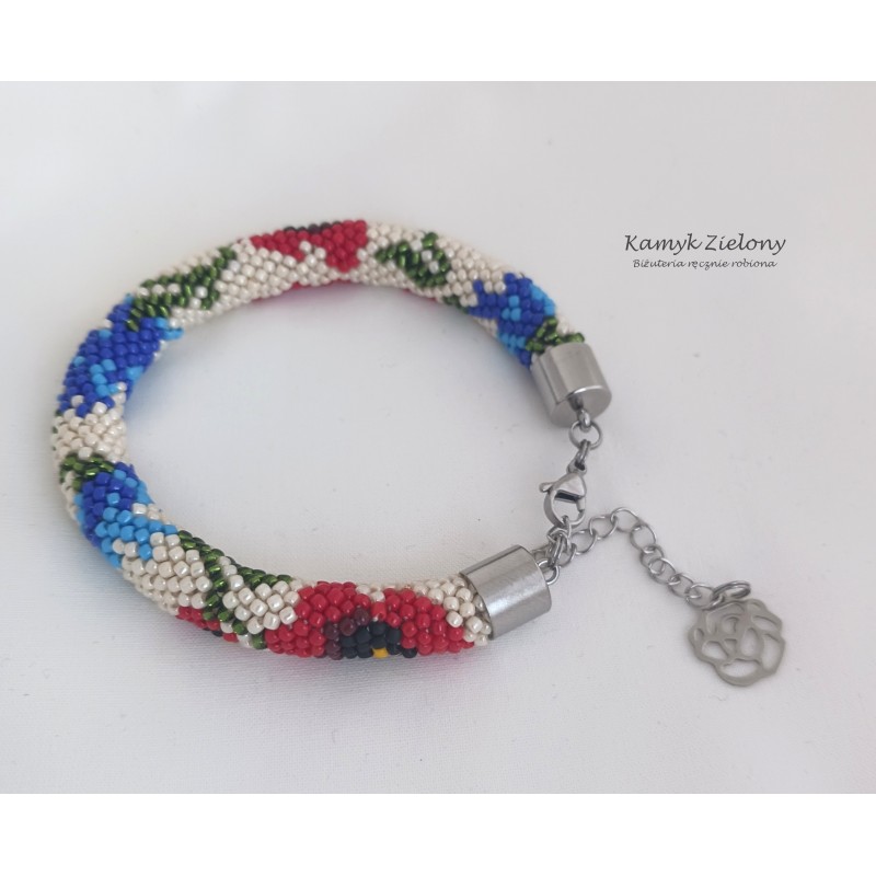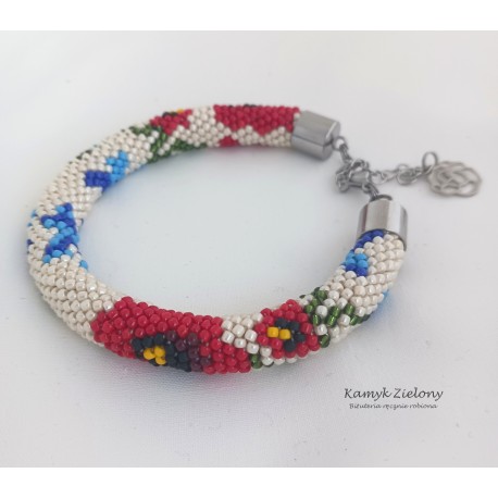 Bransoletka z wzorkiem w maki oraz chabry, wykonana ze szklanych, japońskich koralików Toho.