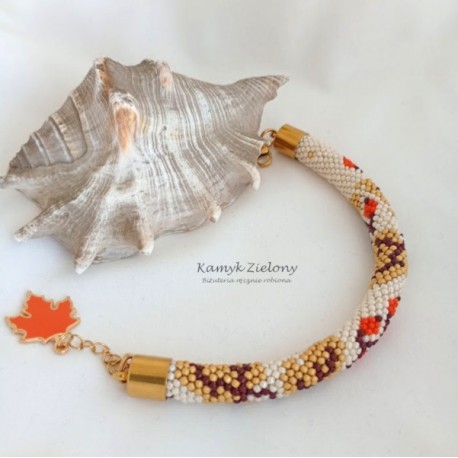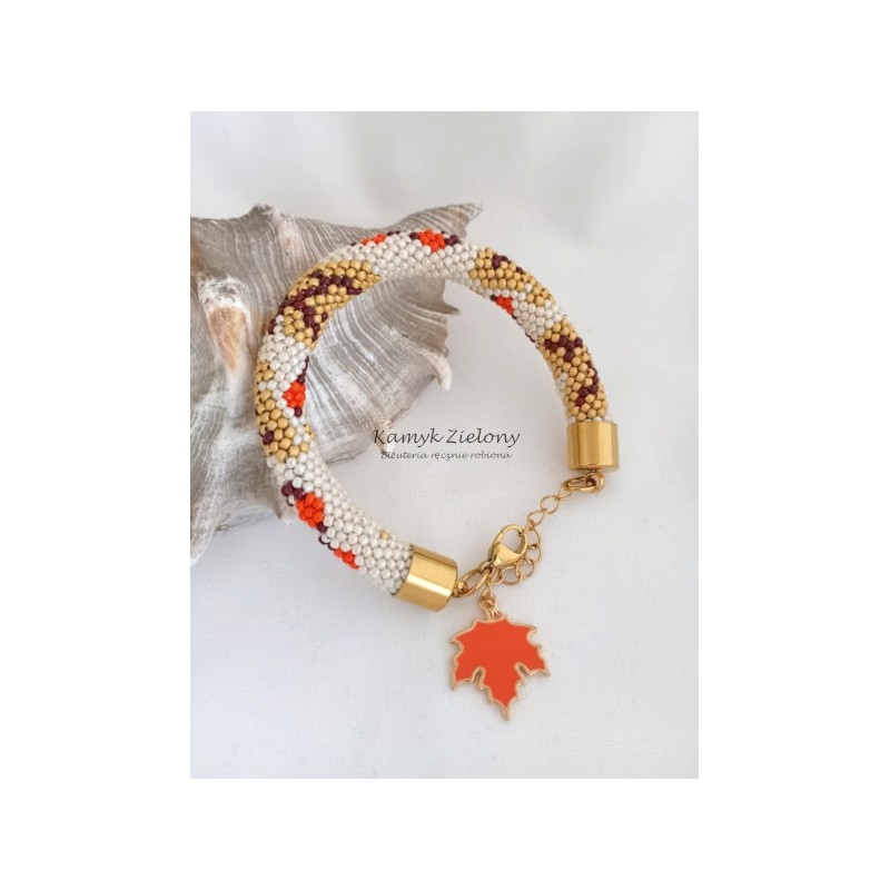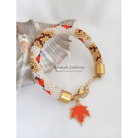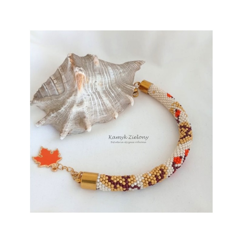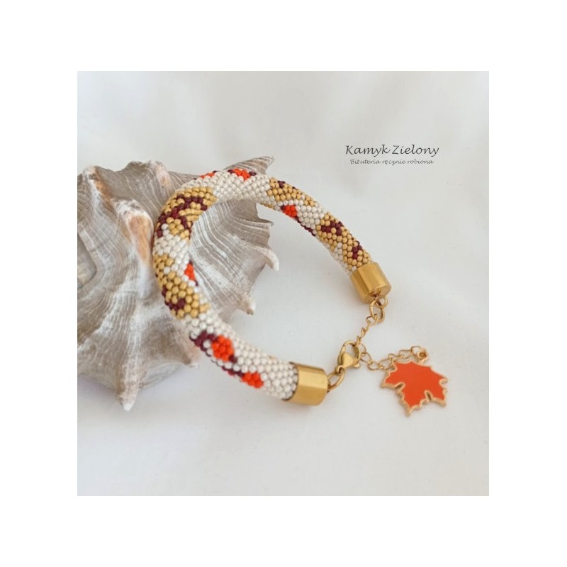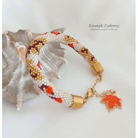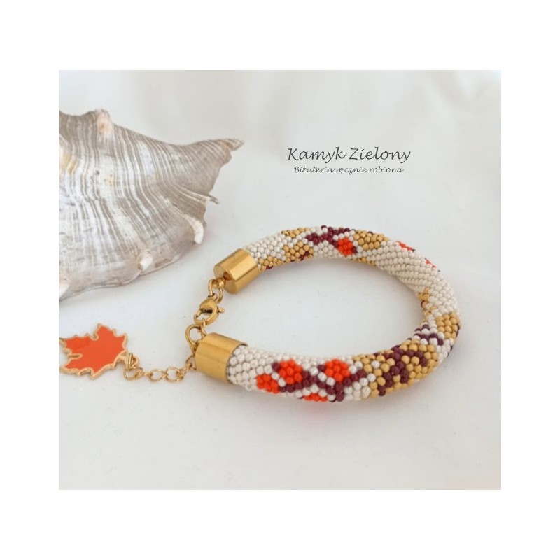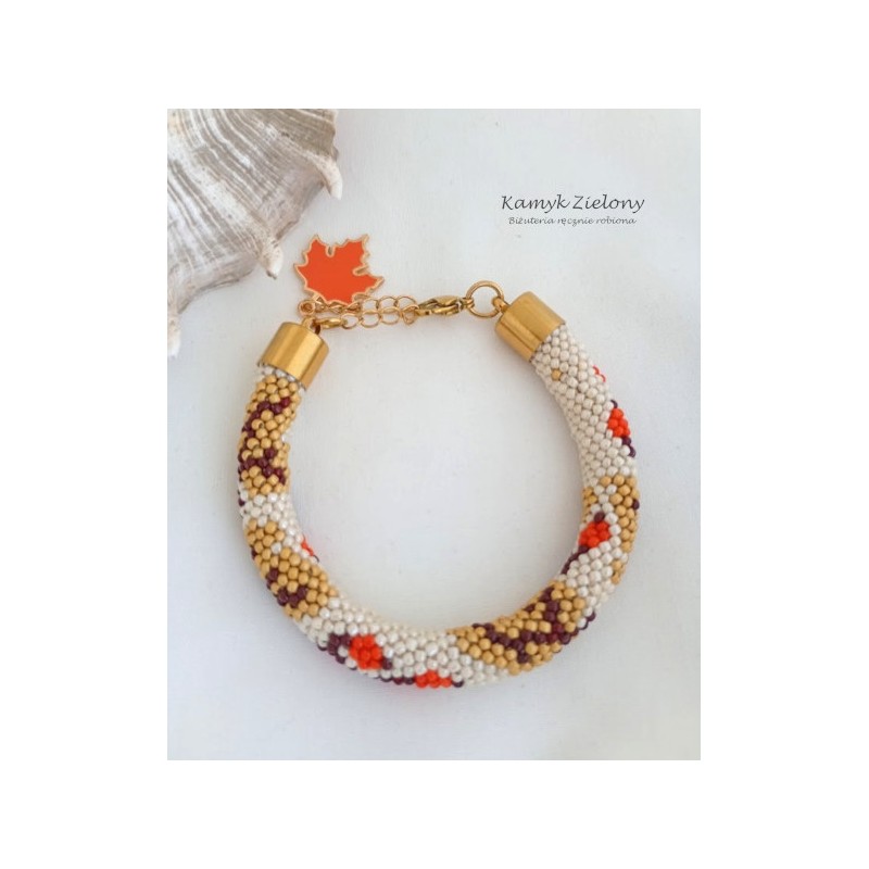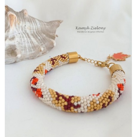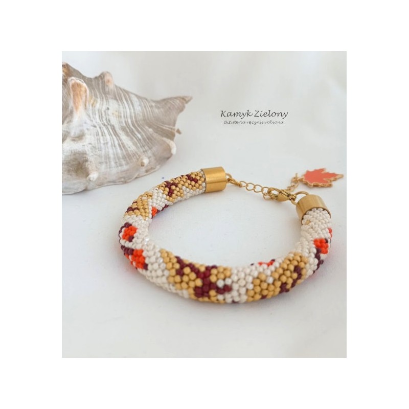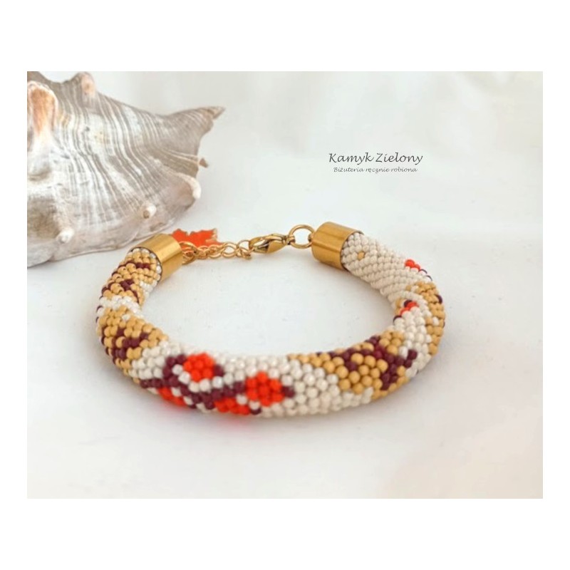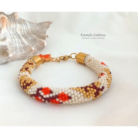 Bransoletka o nieco grubszym przekroju wykonana ręcznie z drobniutkich koralików Toho, utrzymana w beżowo-pomarańczowo-złotej kolorystyce.