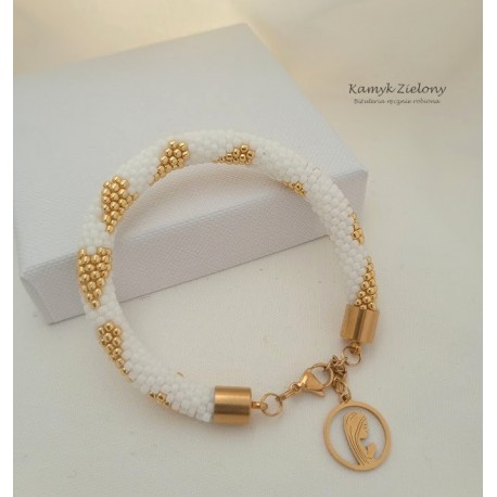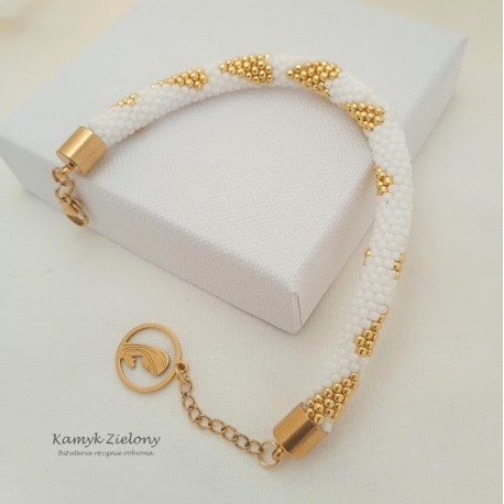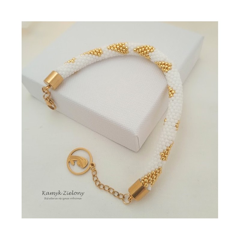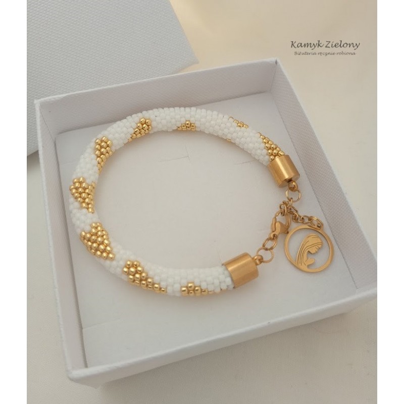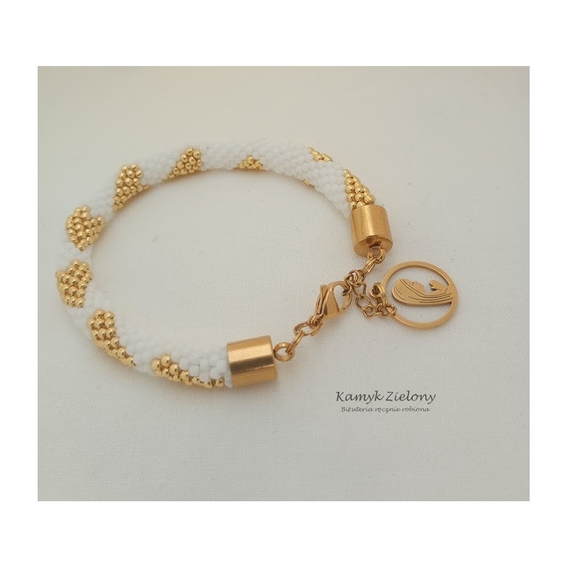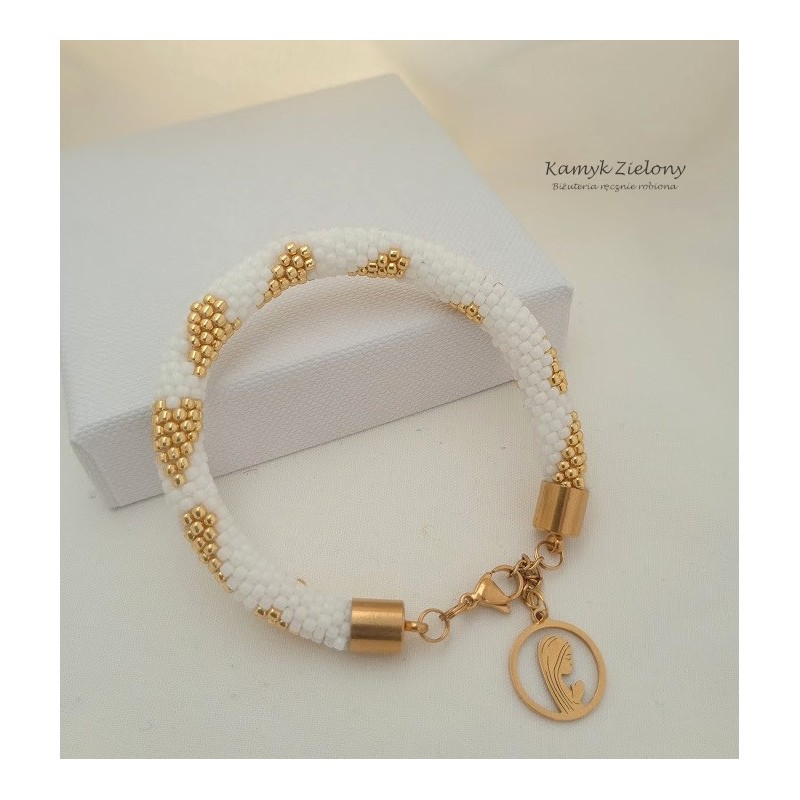 Bransoletka wykonana ręcznie z japońskich koralików Toho. Na tle z koralików w śnieżnobiałym kolorze umieszczono wzorek w złote serduszka.