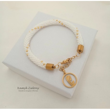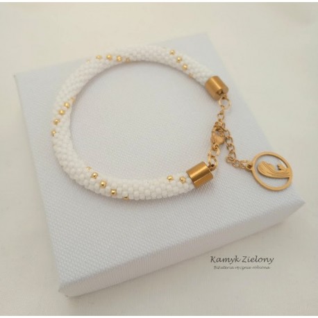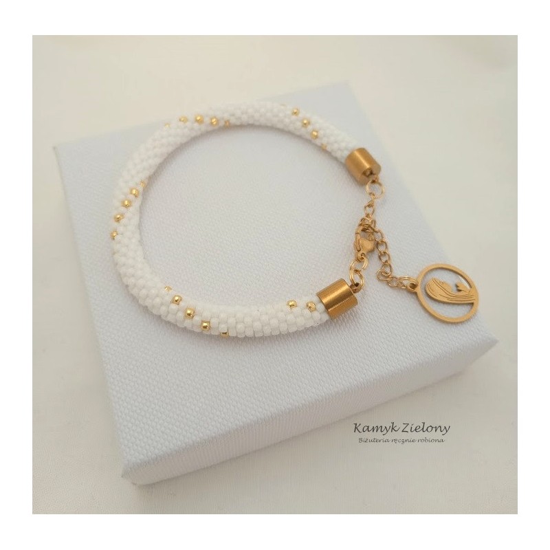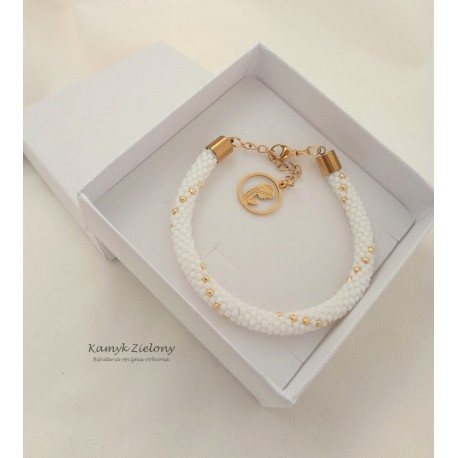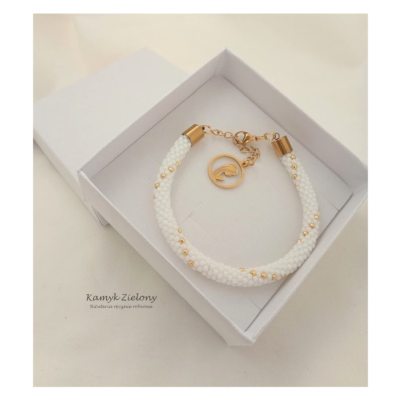 Bransoletka zrobiona ręcznie ze szklanych, japońskich koralików Toho w kolorze śnieżnej bieli i złota.