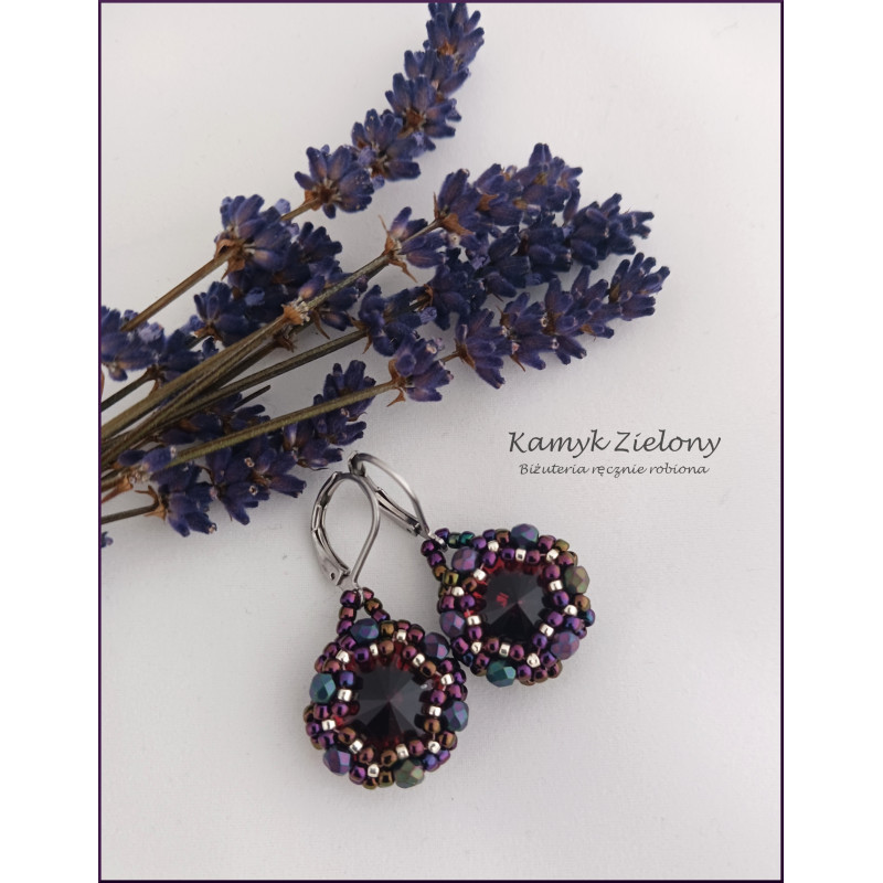 Ręcznie wykonane kolczyki w formie kryształków Rivoli w kolorze ciemnofioletowym, oplecione drobnymi, szklanymi koralikami Toho oraz malutkimi kryształkami w opalizujących odcieniach.