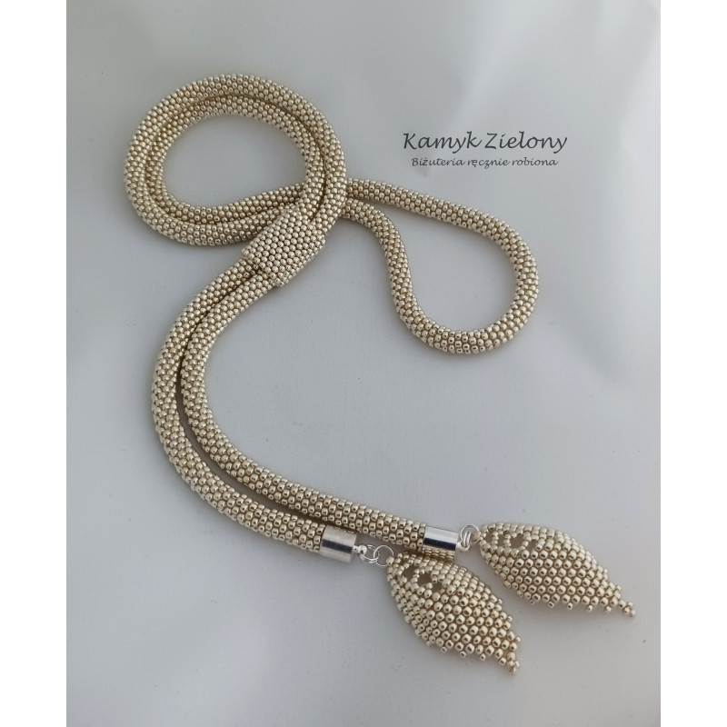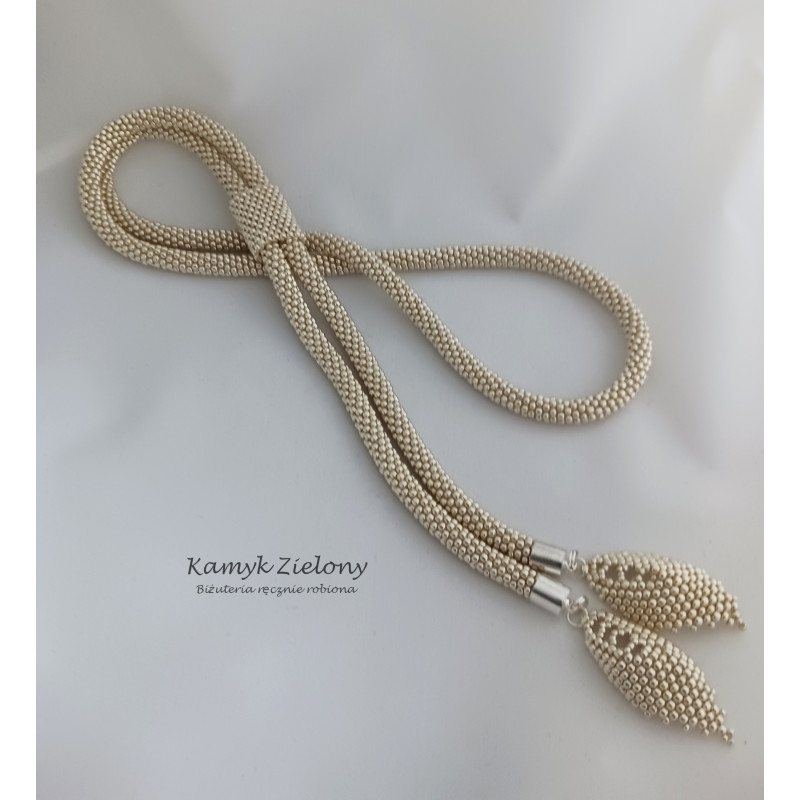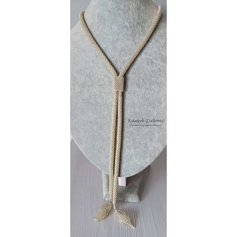 Naszyjnik ma formę dłuższego sznura, którego końce spaja koralikowa opaska (można regulować jej wysokość na sznurze). Końce naszyjnika ozdobiono ręcznie uszytymi koralikowymi listkami.