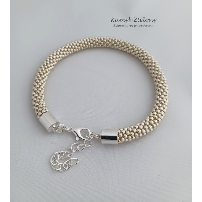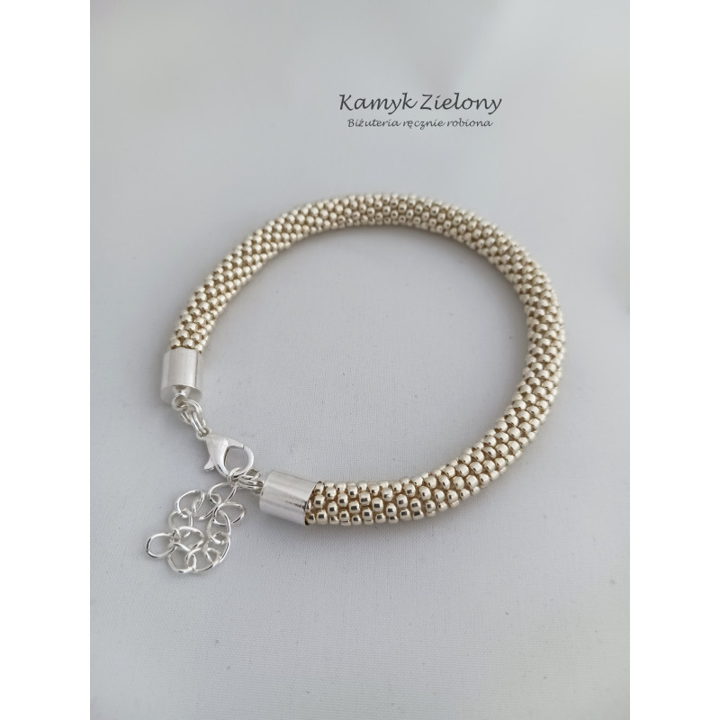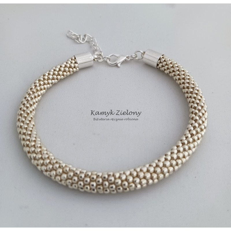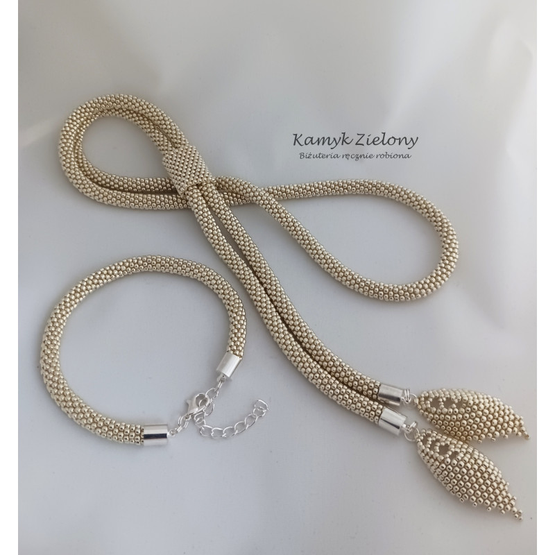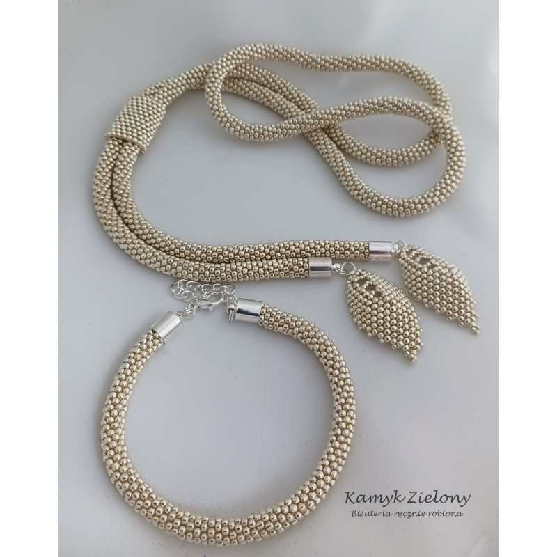 Całość została zrobiona z wysokiej jakości koralików Toho w kolorze jasnego srebra, wpadającego w złotawy odcień. Przepiękny i unikatowy komplet dla lubiących niecodzienną biżuterię i spokojną klasykę.