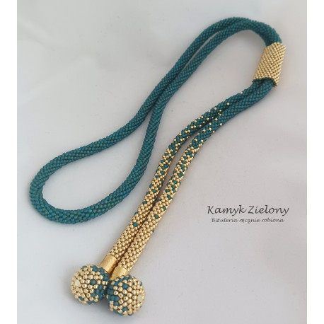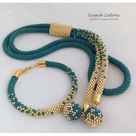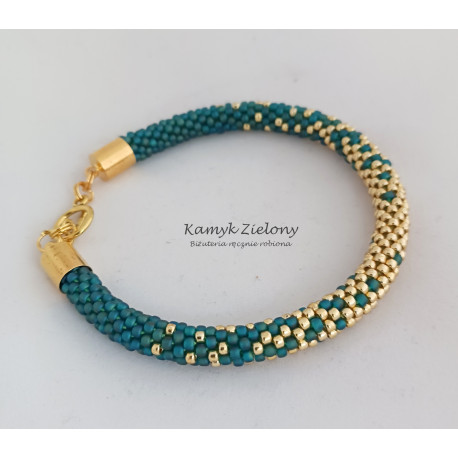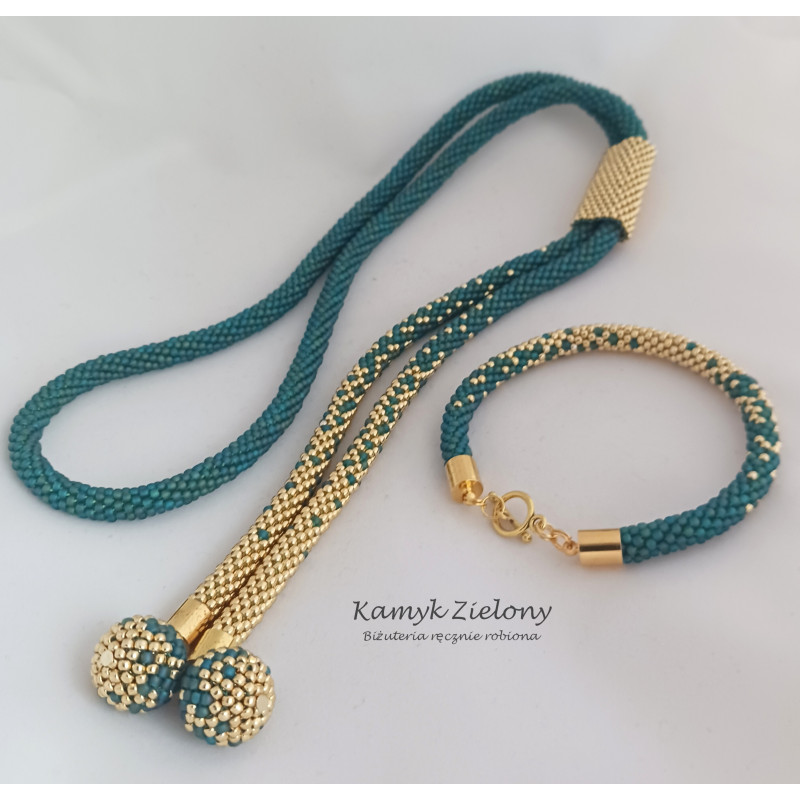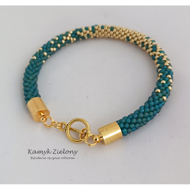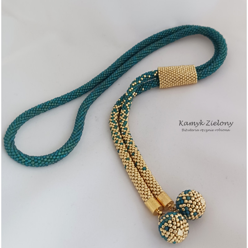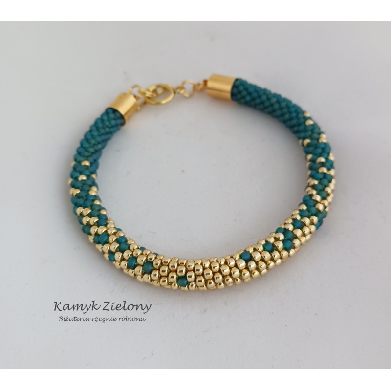 Całość wykonano z wysokiej jakości japońskich, szklanych koralików Toho w dwóch kolorach - szmaragdowym oraz złotym.