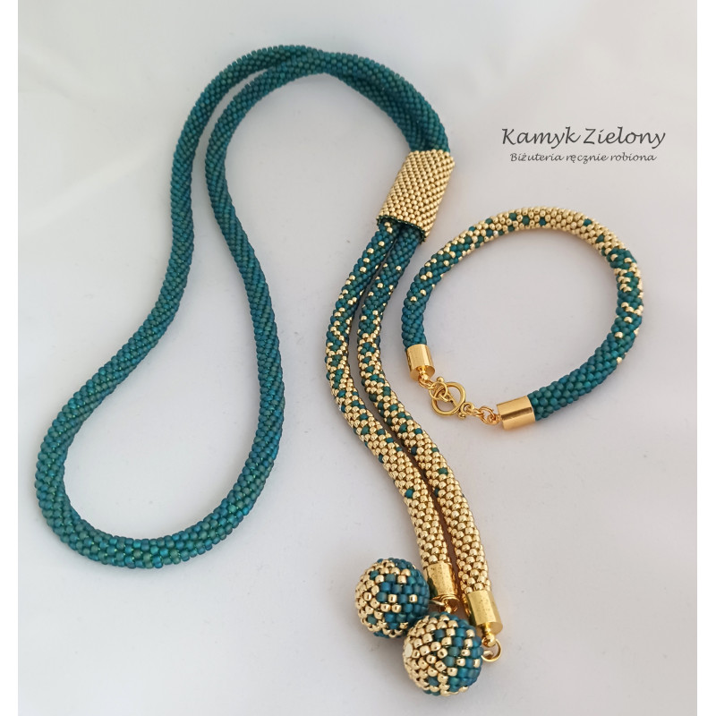 Komplet biżuterii składający się z dłuższego naszyjnika oraz bransoletki.