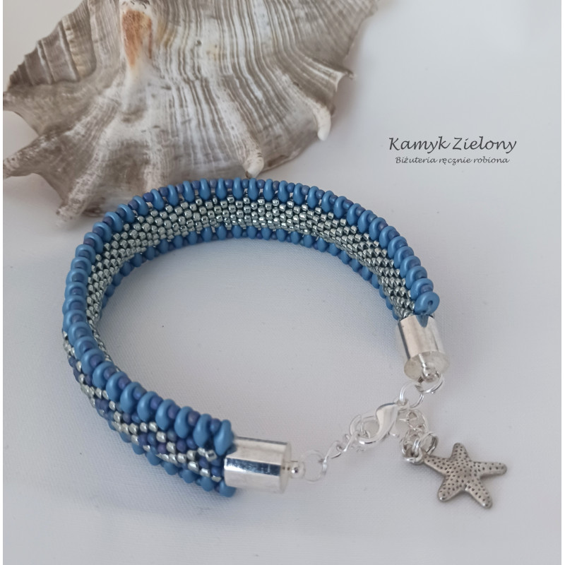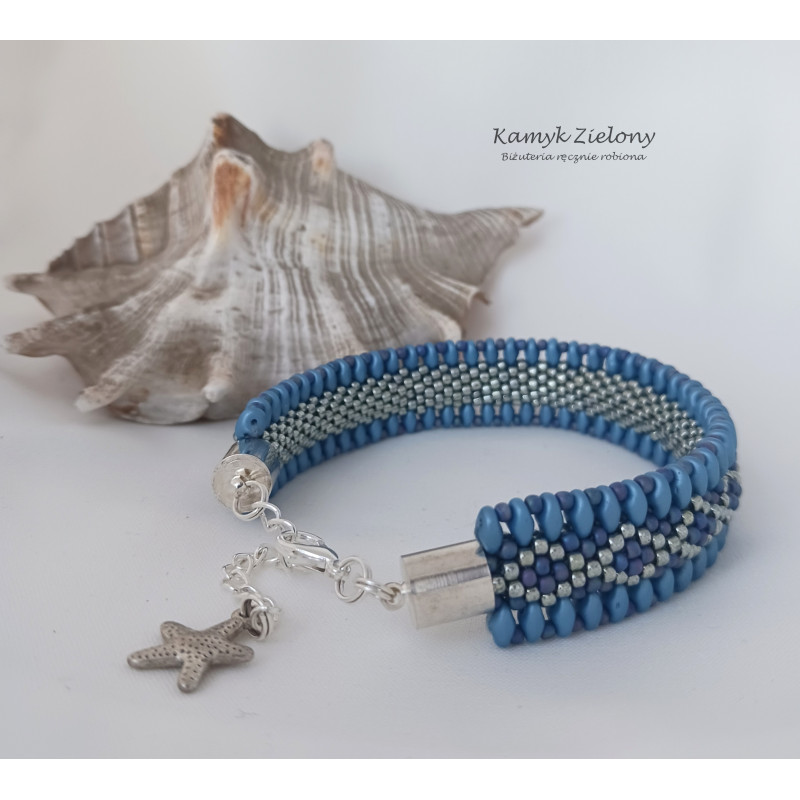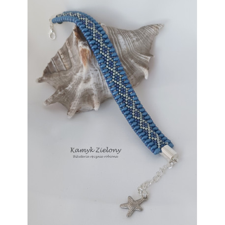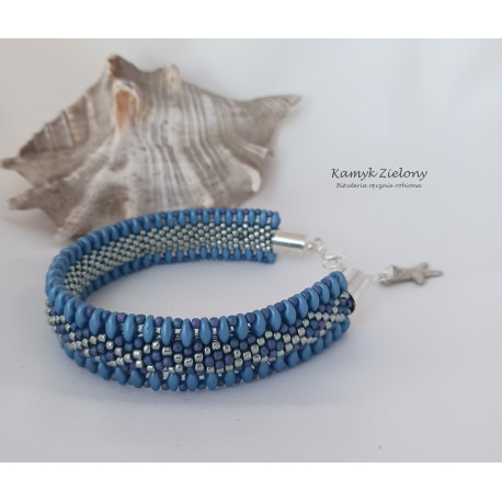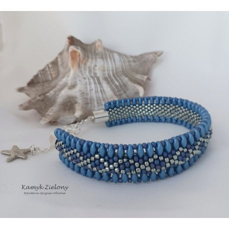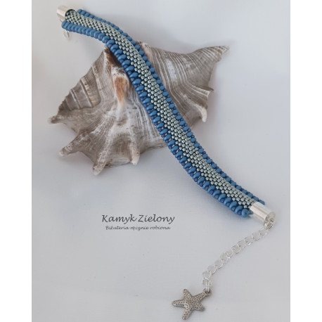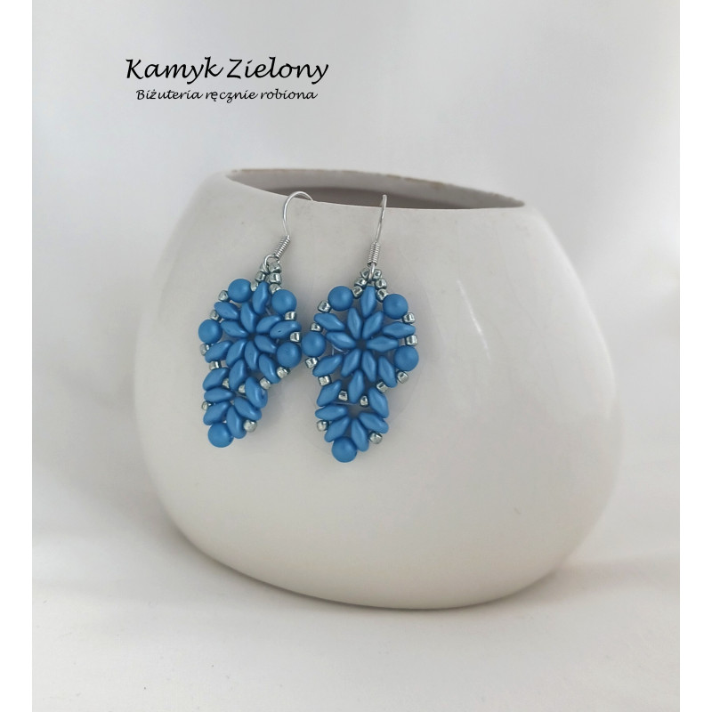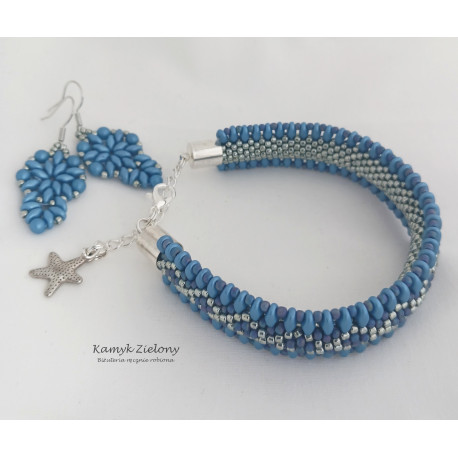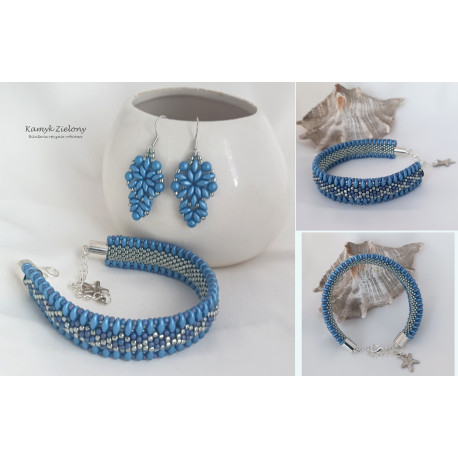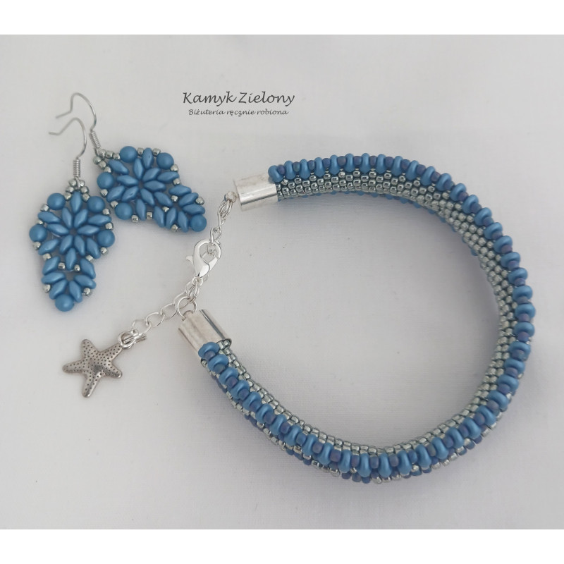 Zestaw biżuterii, składający się z płaskiej bransoletki typu "gąsieniczka" oraz wiszących kolczyków. Całość została zrobiona z kilku rodzajów koralików oraz kuleczek, w tym satynowych kuleczek w pięknym, niebieskim odcieniu.