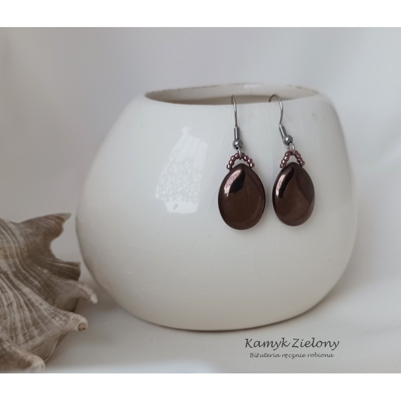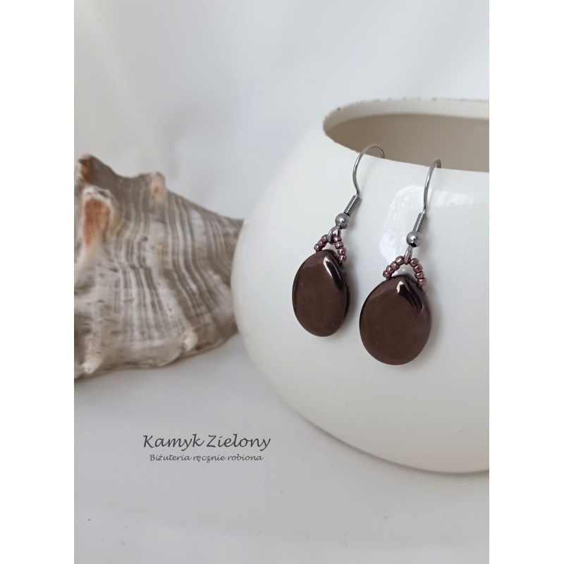 Kolczyki do kompletu to mniejsze łezki z brązowego hematytu zawieszone na biglach otwartych.