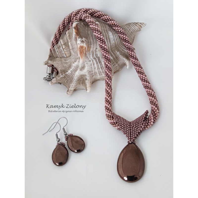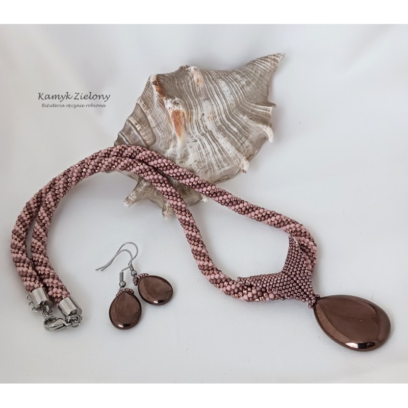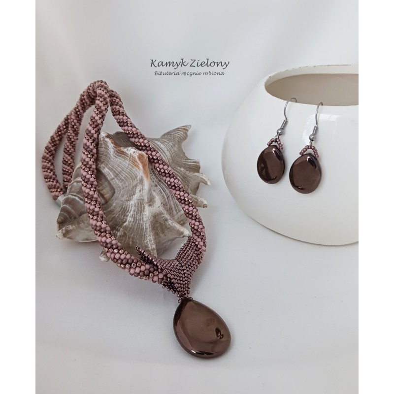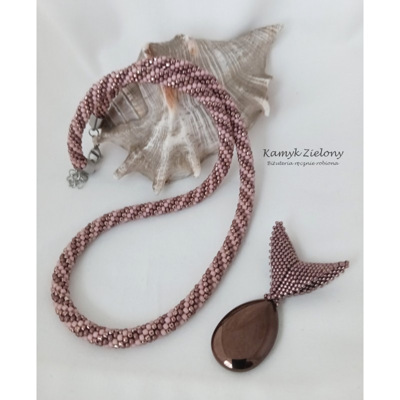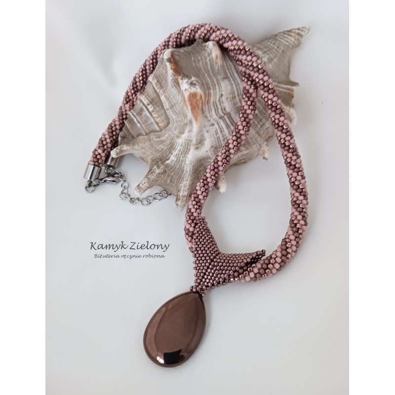 Naszyjnik ma formę sznura koralikowego zrobionego ze szklanych koralików Toho w odcieniu miedzianym, błyszczącym i matowym oraz w kolorze pudrowego różu.