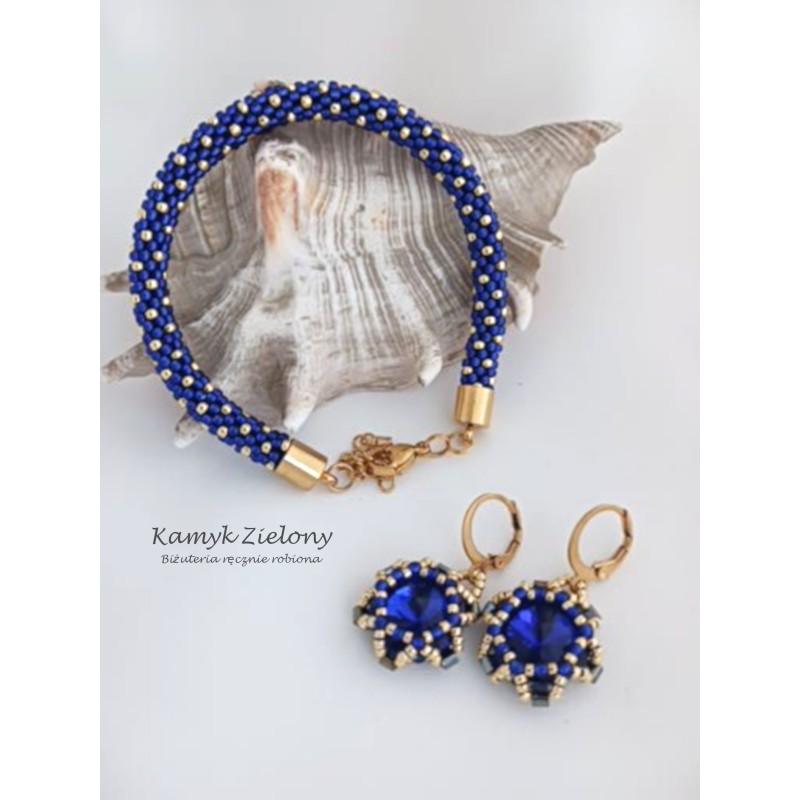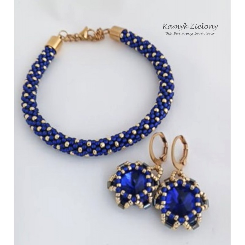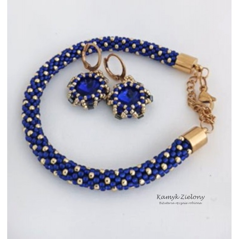 Komplet z granatowymi kryształkami składający się z bransoletki oraz kolczyków.