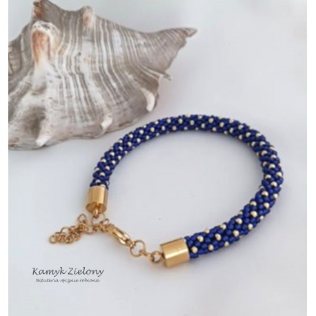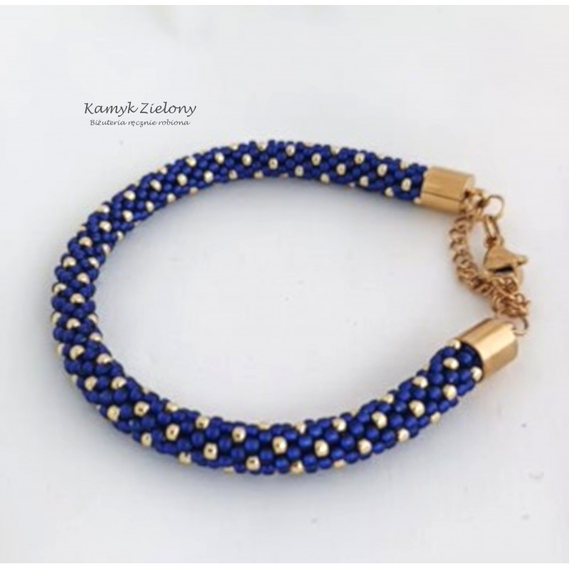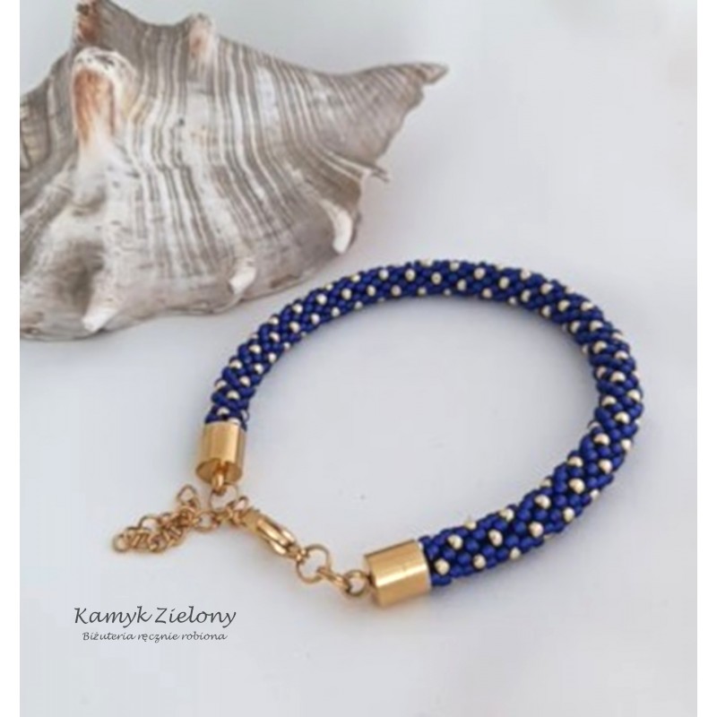 Bransoletka do kompletu, kobaltowa w złote kropeczki ma regulowaną długość, dzięki zastosowaniu zapięcia typu karabińczyk z łańcuszkiem przedłużającym.