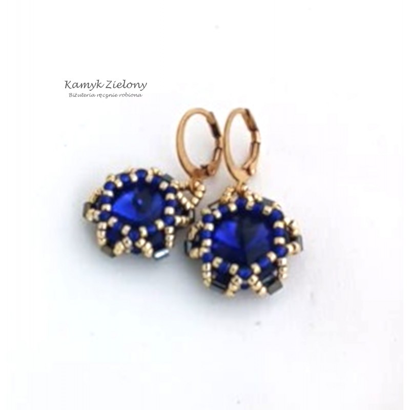 Kolczyki to oprawione w koraliki Toho i Miyuki kryształki w kolorze kobaltowym, zawieszone na stalowych biglach otwartych.