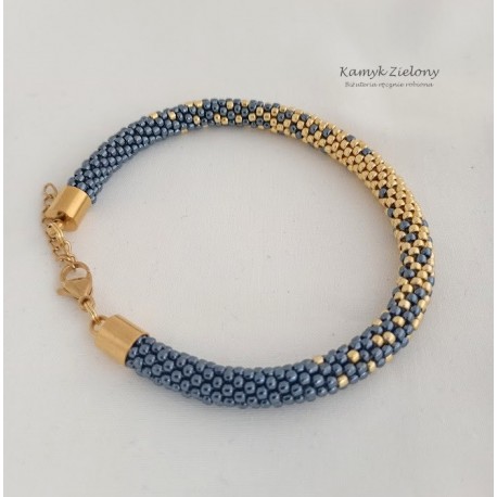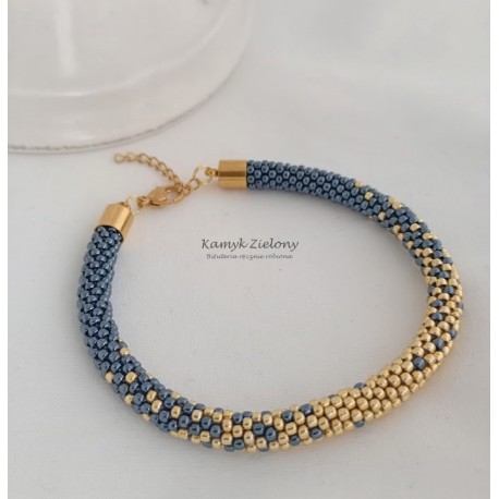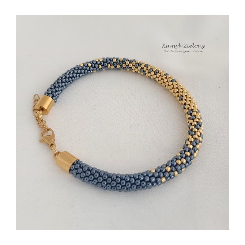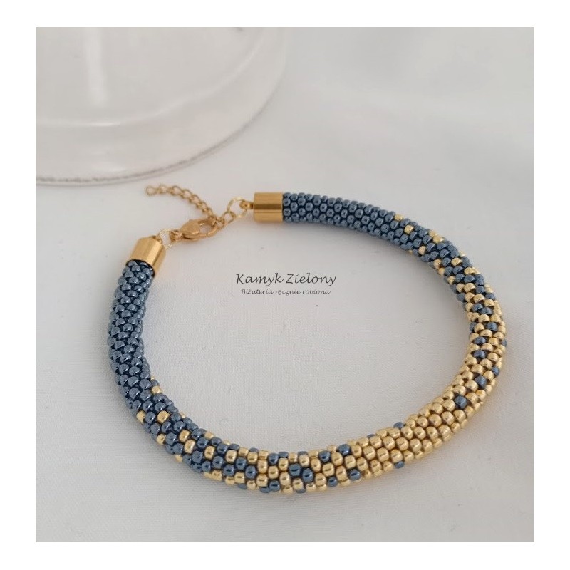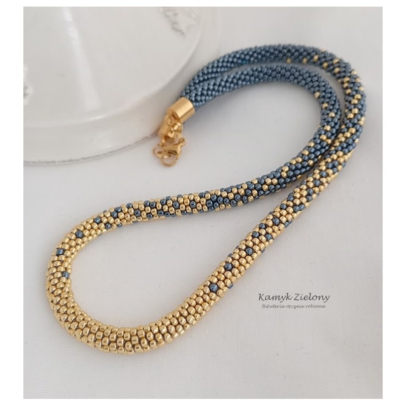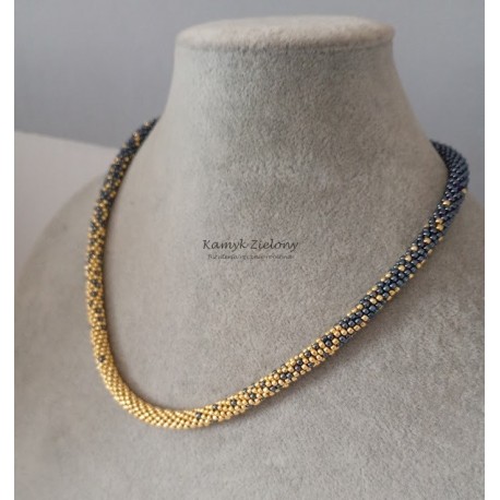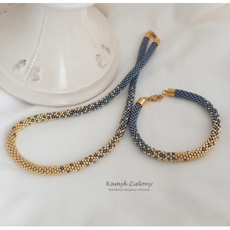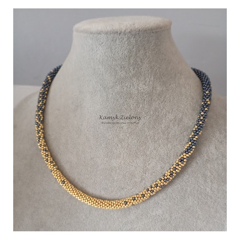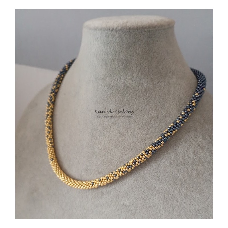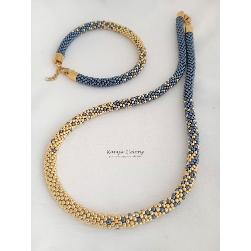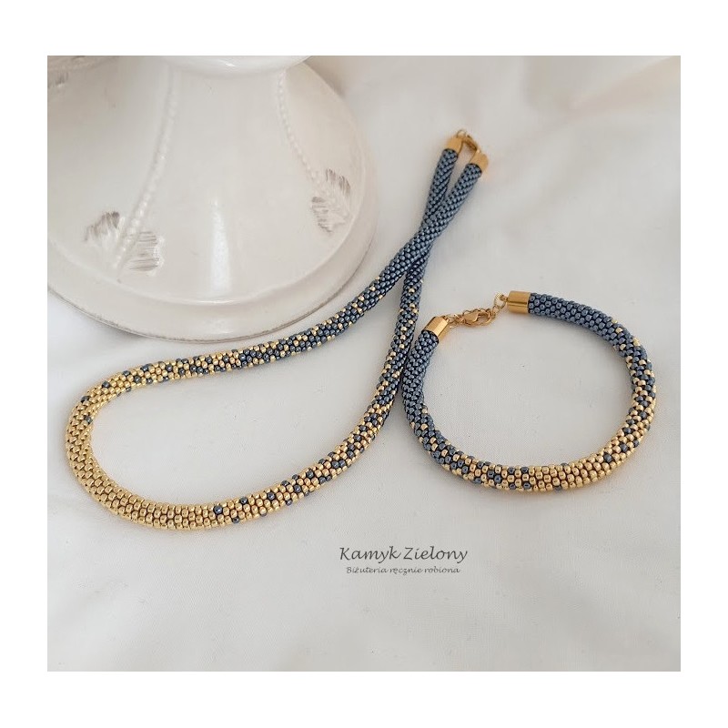 Naszyjnik i bransoletka wykonane ręcznie z drobnych, szklanych koralików Toho w kolorze hematytowym oraz złotym. Koraliki wykorzystane do jego zrobienia wyróżniają się doskonałą jakością i trwałością. Kolor koralików nie ściera się ani nie blaknie w trakcie użytkowania biżuterii.