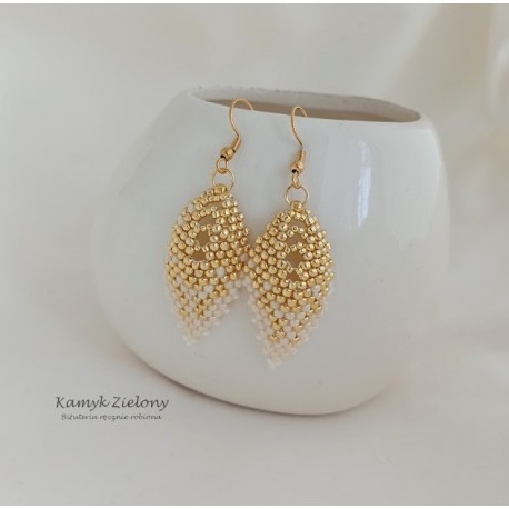 Kolczyki mają formę niedużych listków i zostały uszyte ręcznie z koralików tego samego rodzaju, co sznury naszyjnika i bransoletki.