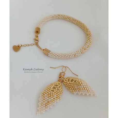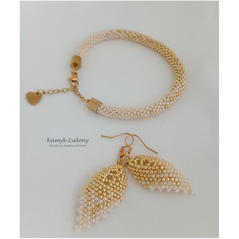 Ręcznie wykonany komplet biżuterii z koralików Toho - japońskich szklanych koralików w kolorze jasnego beżu oraz złotym.