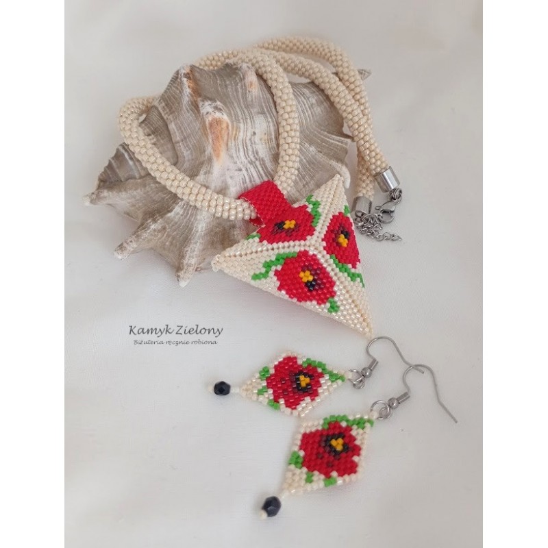 Komplet biżuterii składający się z koralikowego naszyjnika z dużą, trójkątną zawieszką oraz kolczyków.