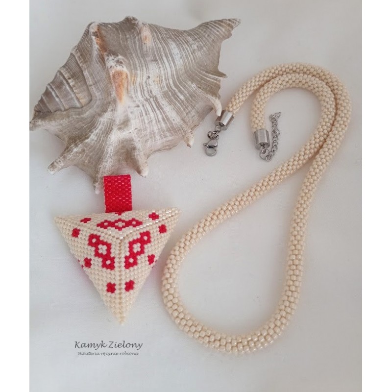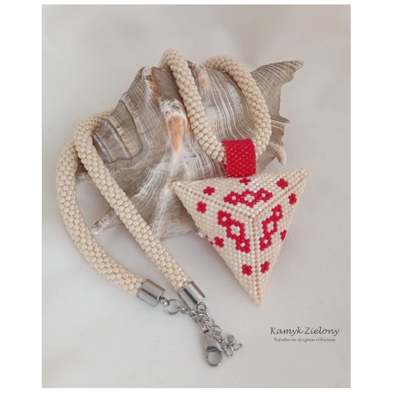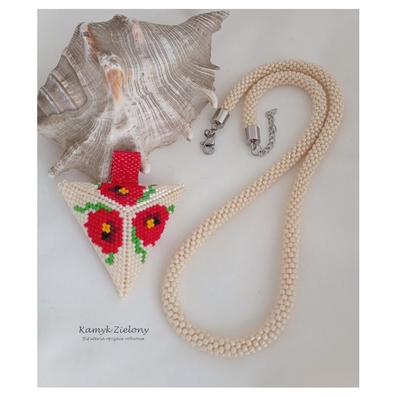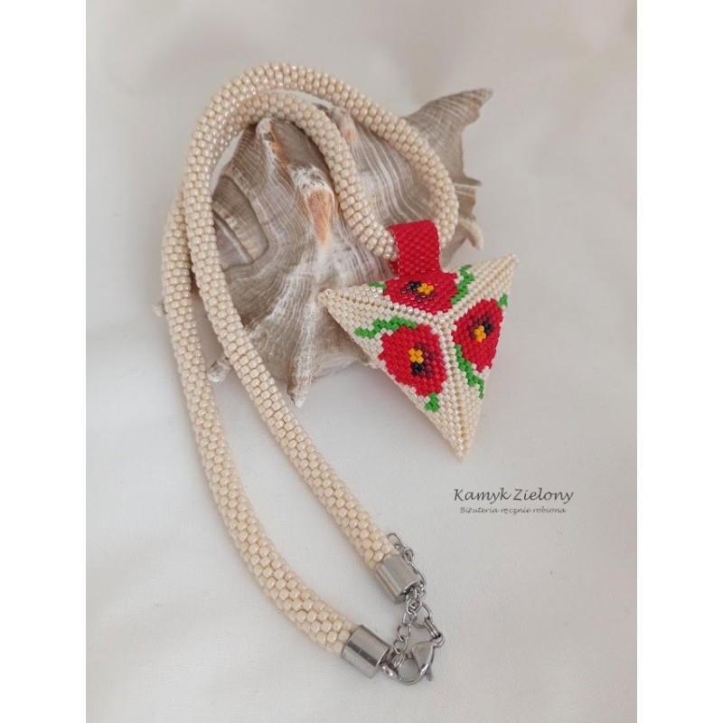 Trójkątna zawieszka jest dwustronna - na jednej stronie umieszczony został wzór czerwonych maków, na drugiej zaś prosty czerwony ornament. Dzięki temu naszyjnik można nosić w dwóch odsłonach.