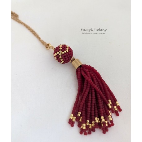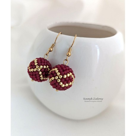 Bransoletka ma formę "gąsieniczki" i jest dwustronna - z jednej strony w całości ze złotym koralików, a z drugiej z bordowo-złotym wzorkiem.