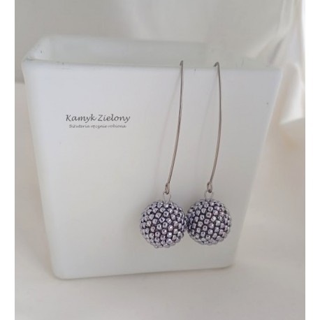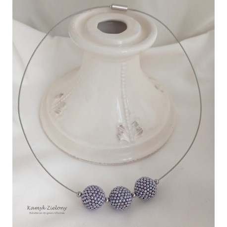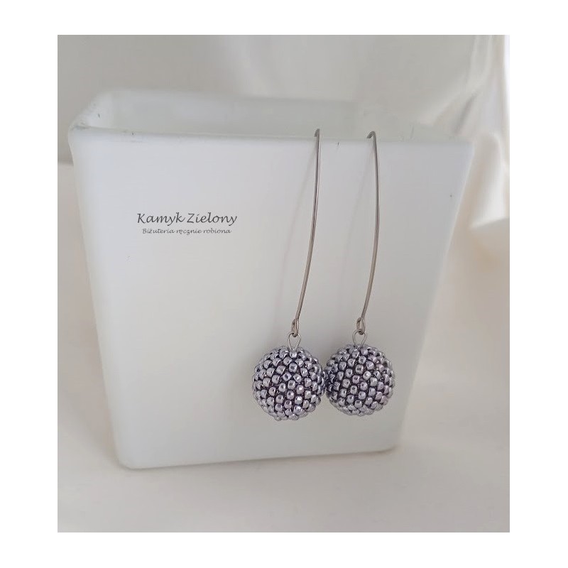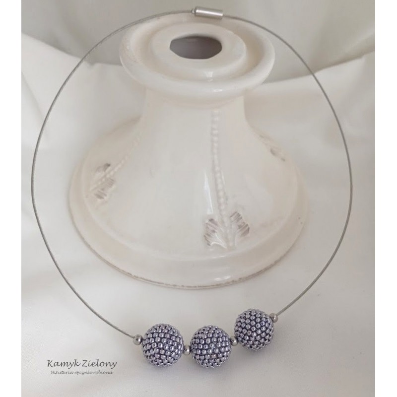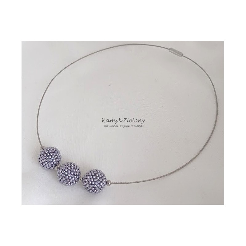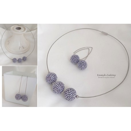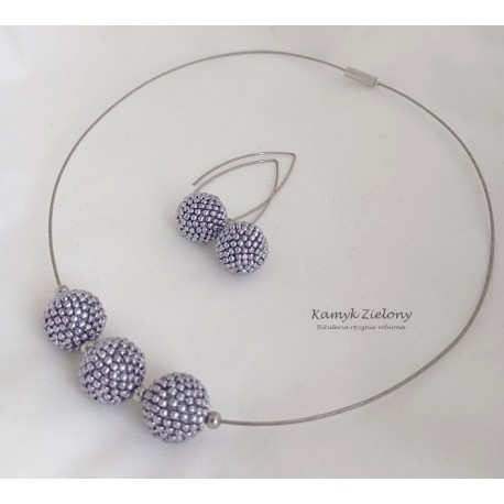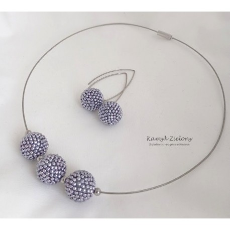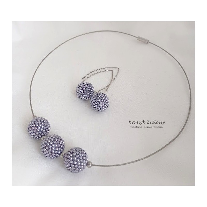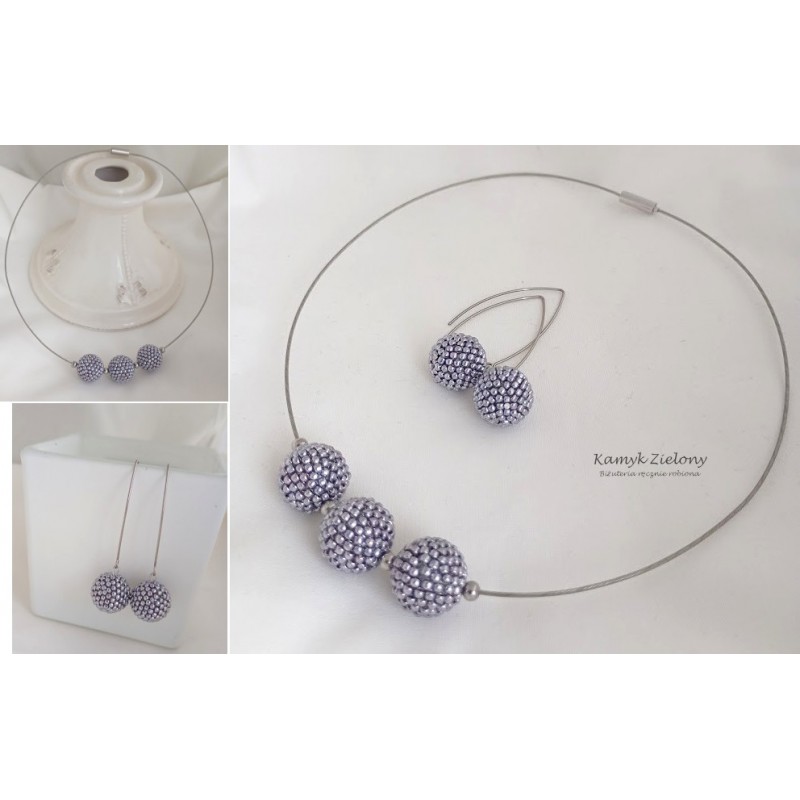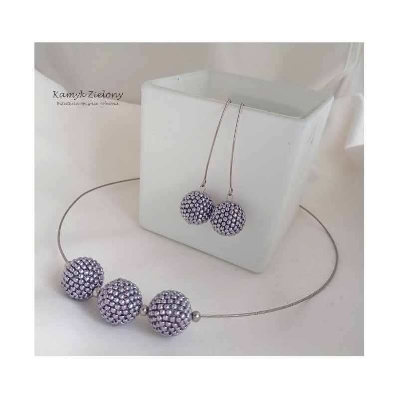 Wykonany został z wysokiej jakości japońskich koralików Toho w kolorze srebrnym. Koralikowe kuleczki, zawieszone na stalowej bazie-naszyjniku oraz w kolczykach zrobione zostały z koralików metalizowanych na srebrny kolor metodą galwanizacji. Dzięki temu kolor koralików jest trwały, nie ściera się, ani nie zmienia w trakcie użytkowania biżuterii.