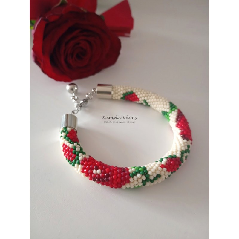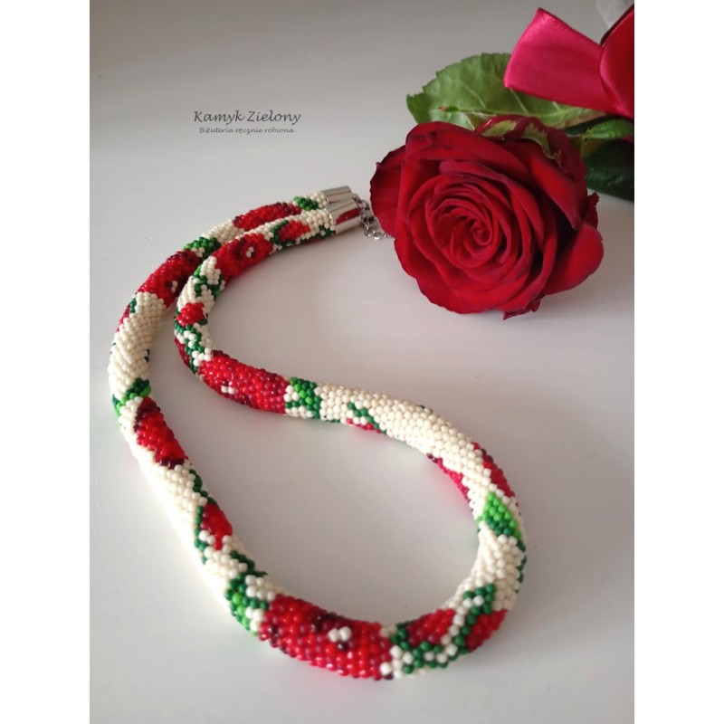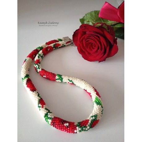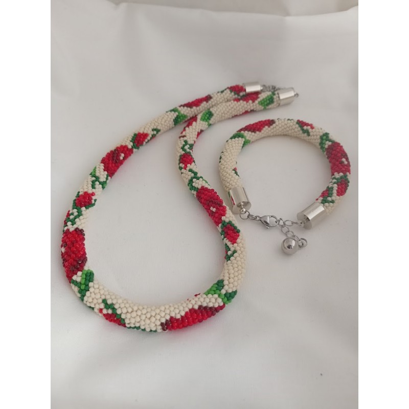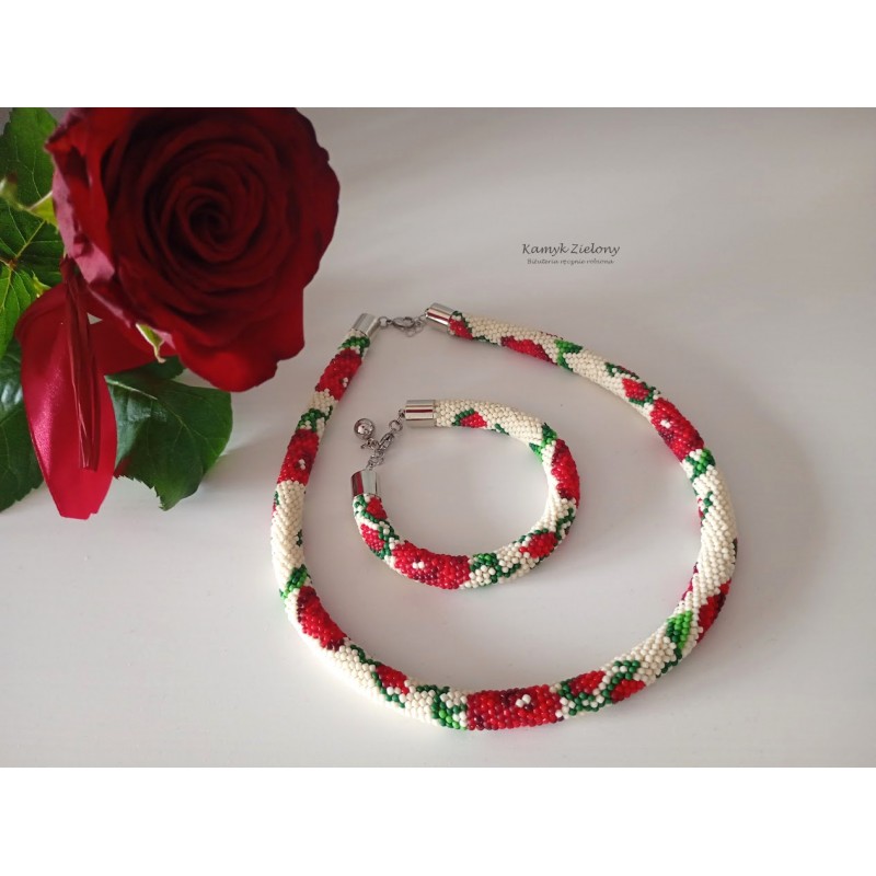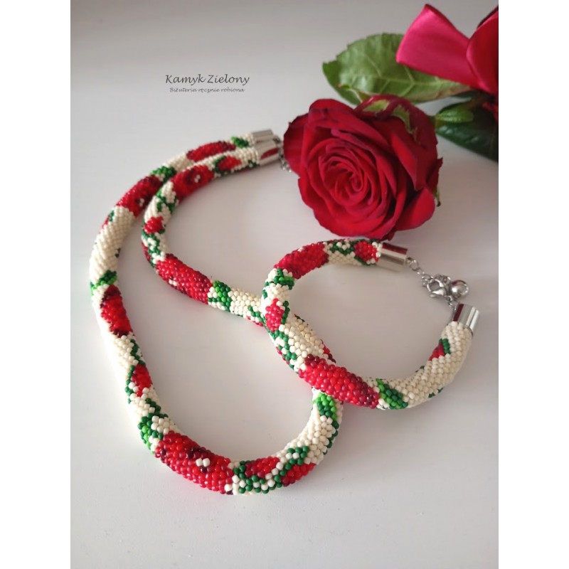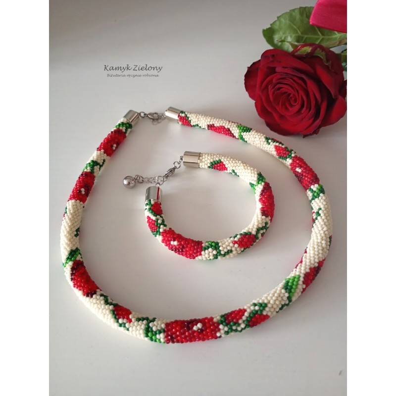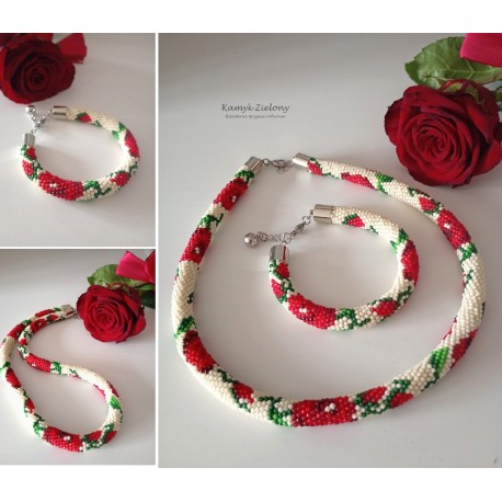 Komplet - naszyjnik i bransoletka z wzorem w czerwone róże.