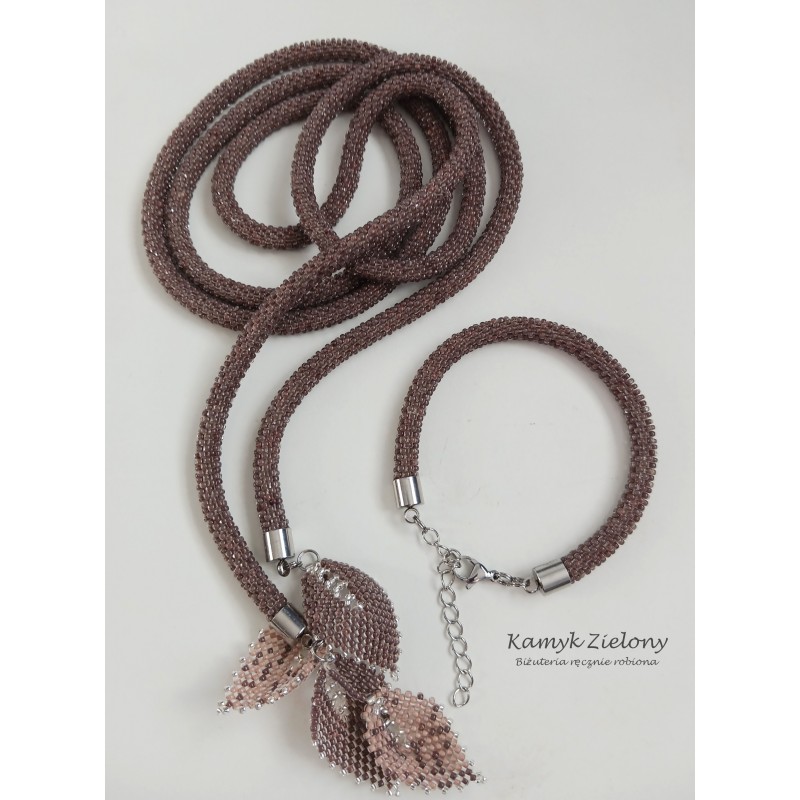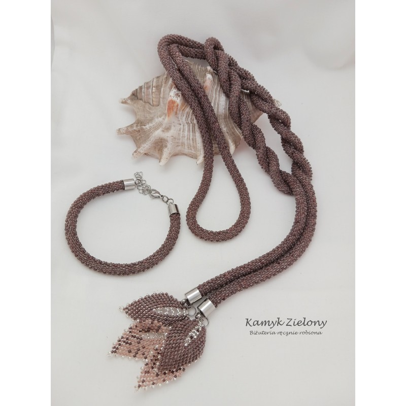 Zestaw biżuterii składający się z długiego naszyjnika do wiązania, czyli lariatu oraz bransoletki. Całość została wykonana ręcznie z drobniutkich koralików Preciosa o średnicy około 2 milimetrów. Koraliki użyte do wykonania naszyjnika i bransoletki to koraliki szklane, ze srebrzonymi środkami, dzięki czemu biżuteria pięknie mieni się w świetle.
