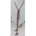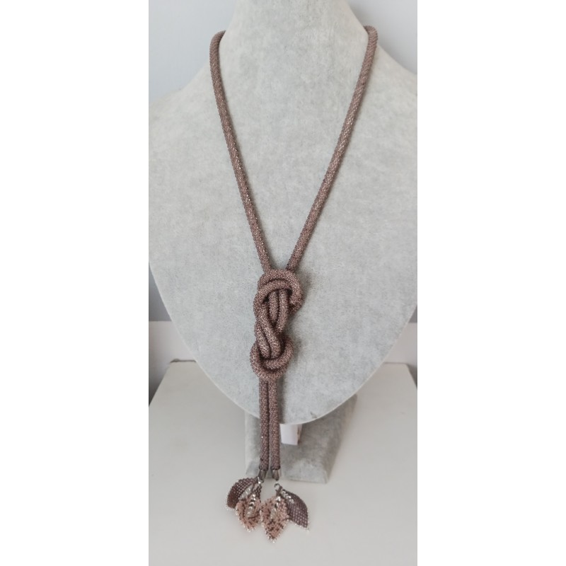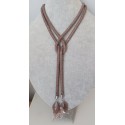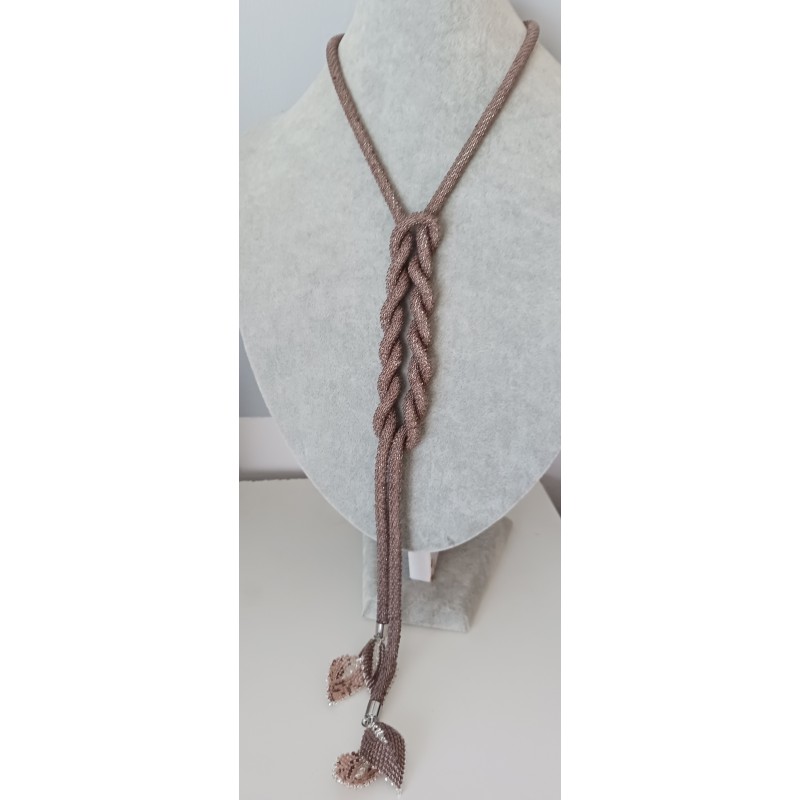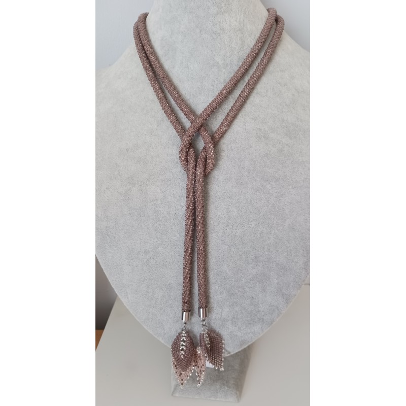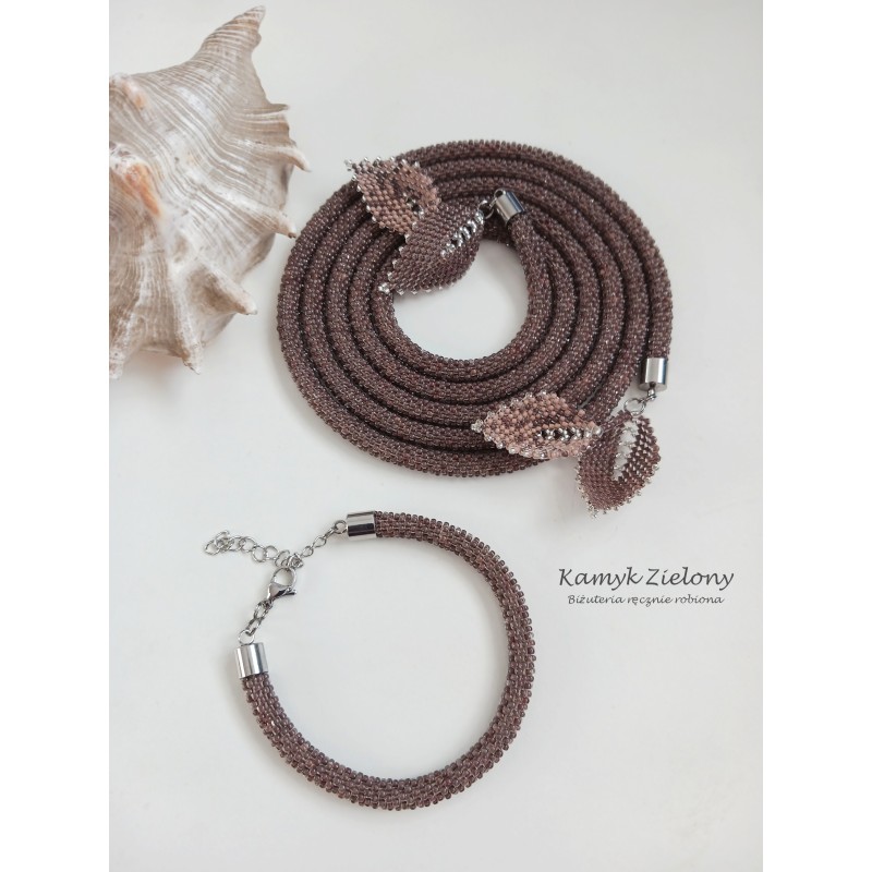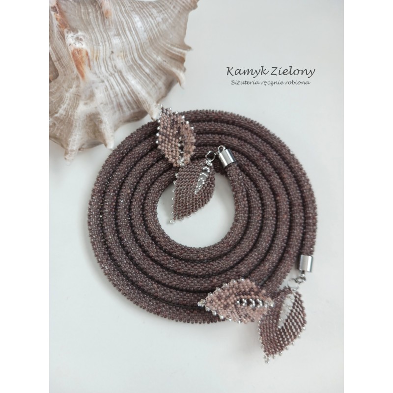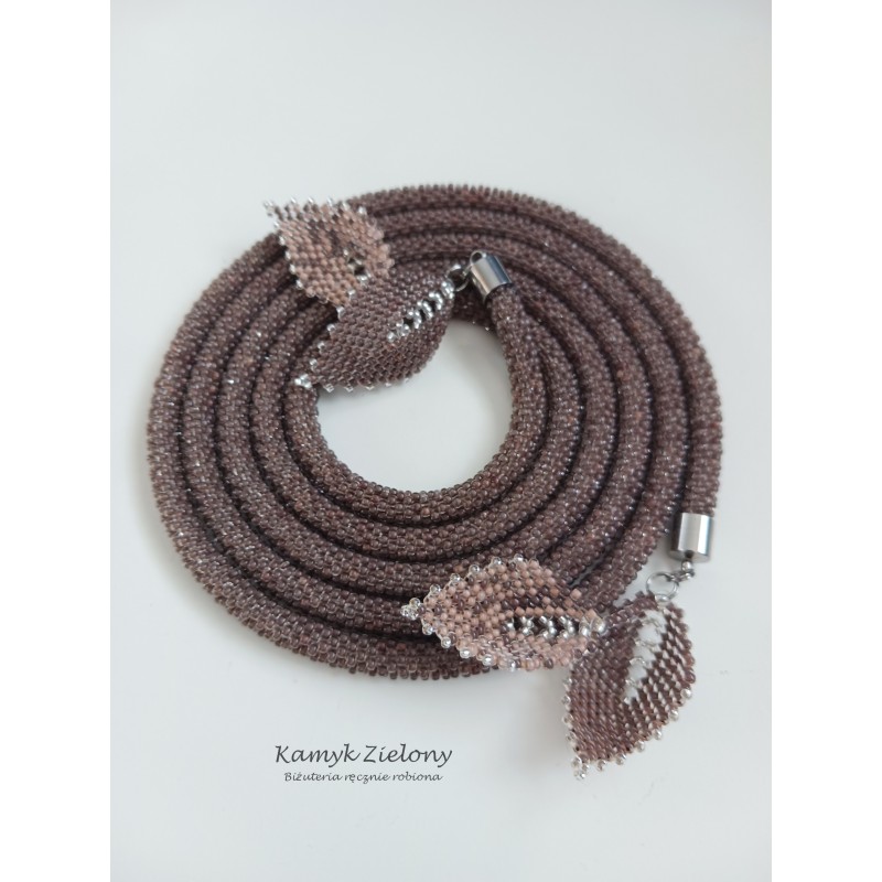 Naszyjnik ma formę długiego sznura koralikowego i nie posiada zapięcia. Można go fantazyjnie wiązać na różne sposoby. Na końcach sznura dopięto na stałe ozdobne listeczki uszyte z tych samych koralików co sznur koralikowy oraz z koralików w kolorze beżowym, idealnie dopasowanym do brązu koralików w sznurze.