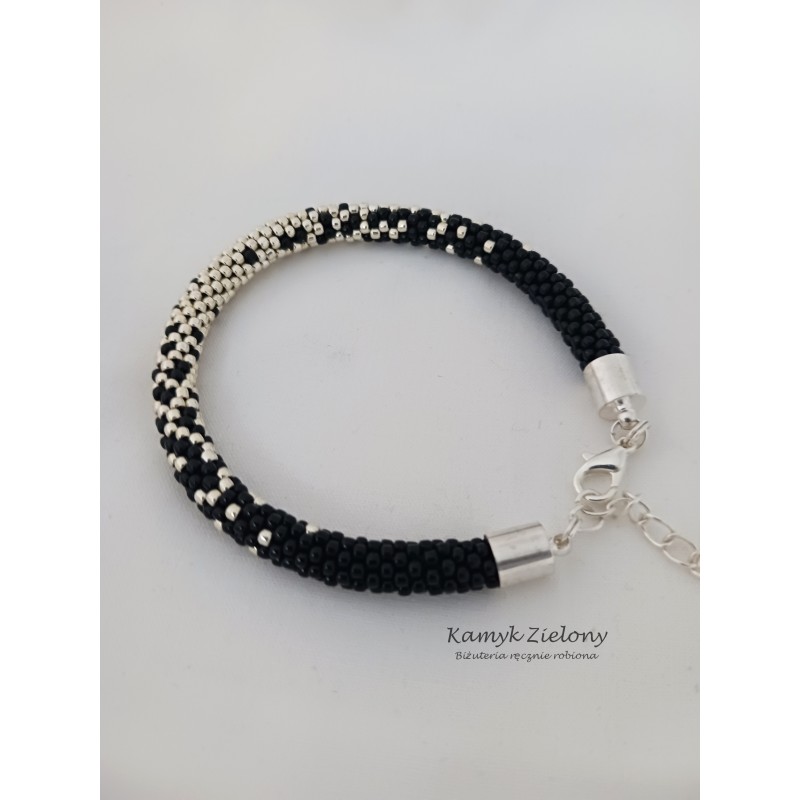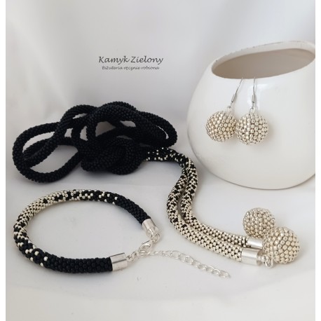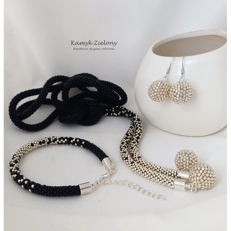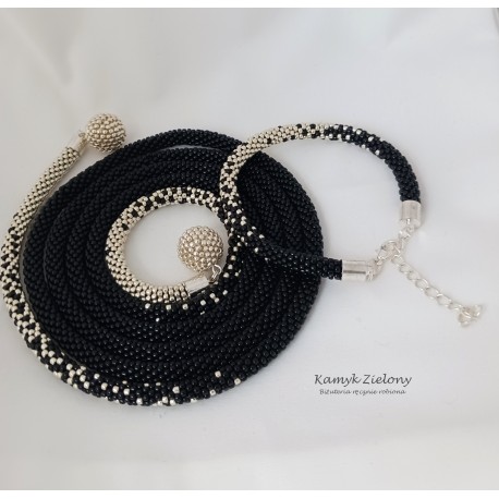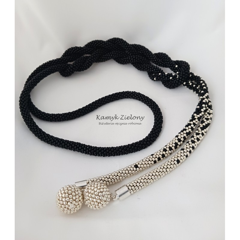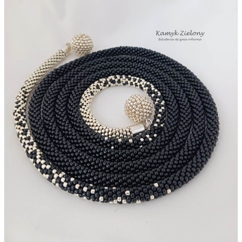 Końce cieniowanego, czarno-srebrnego sznura naszyjnika ozdobiono kuleczkami wykonanymi z koralików Toho w srebrnym kolorze.