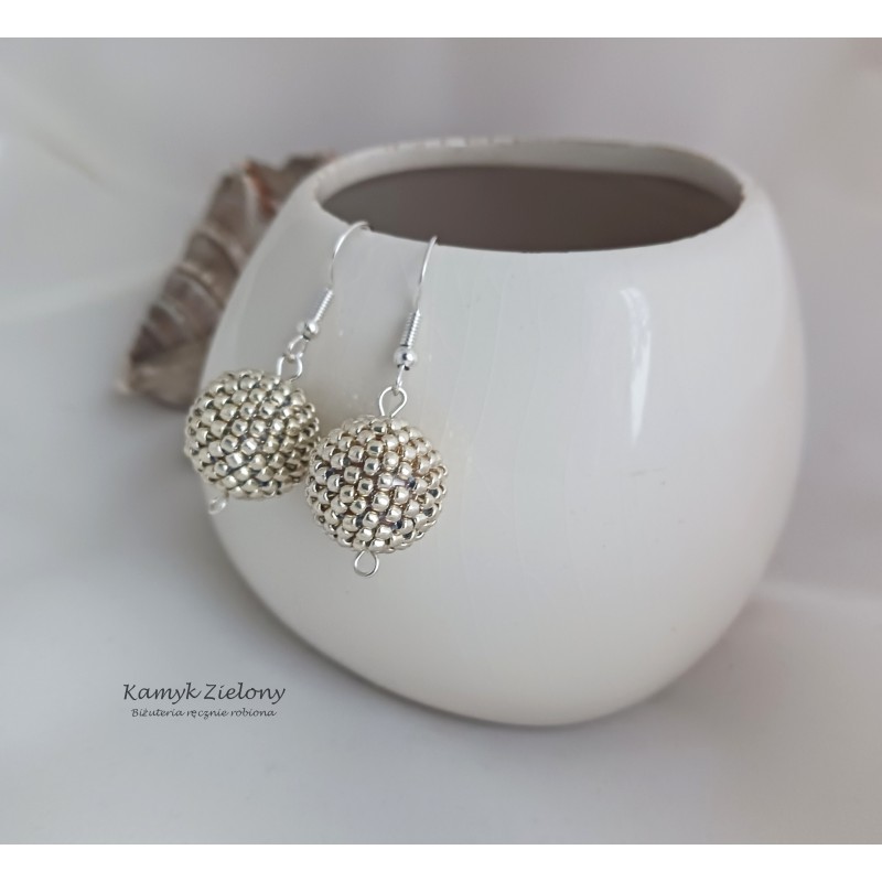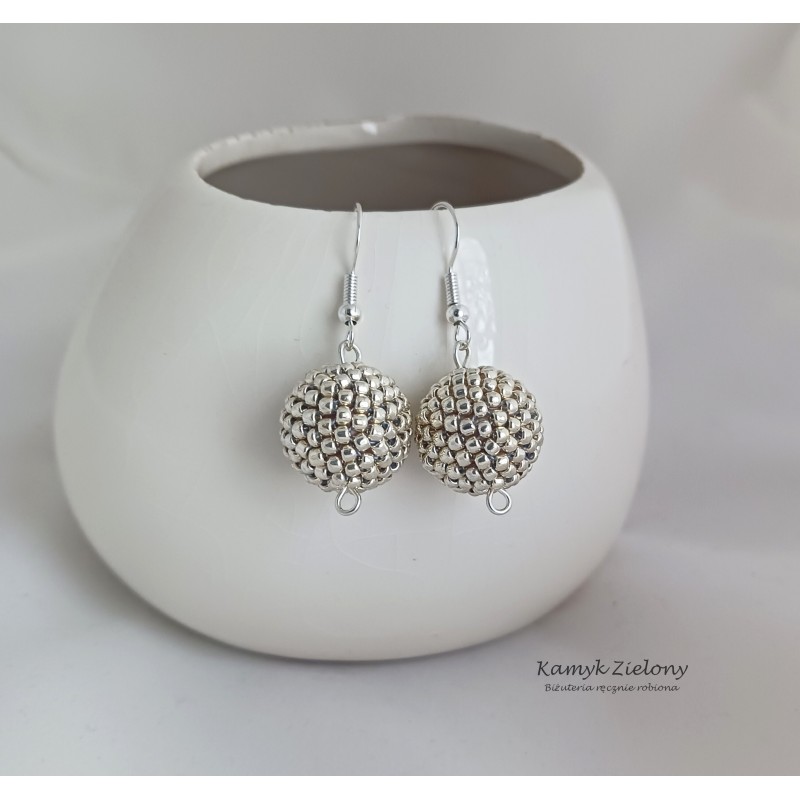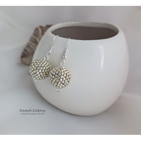 Kolczyki mają postać koralikowych kuleczek w kolorze srebrnym i zostały zawieszone na biglach otwartych.
