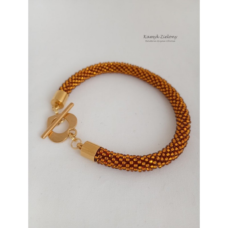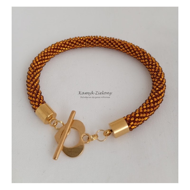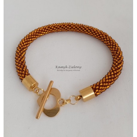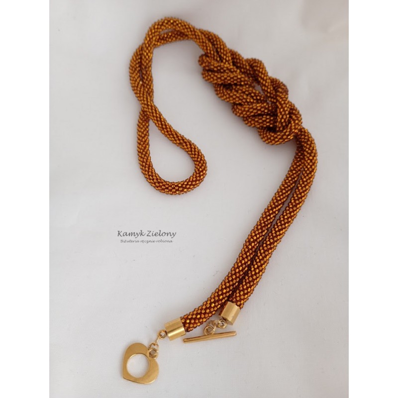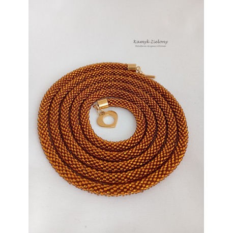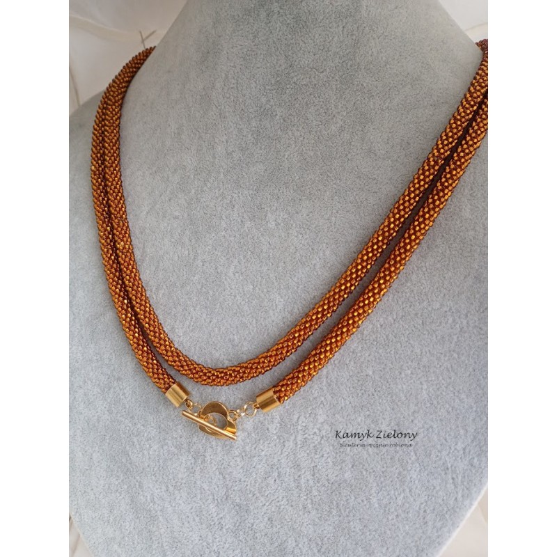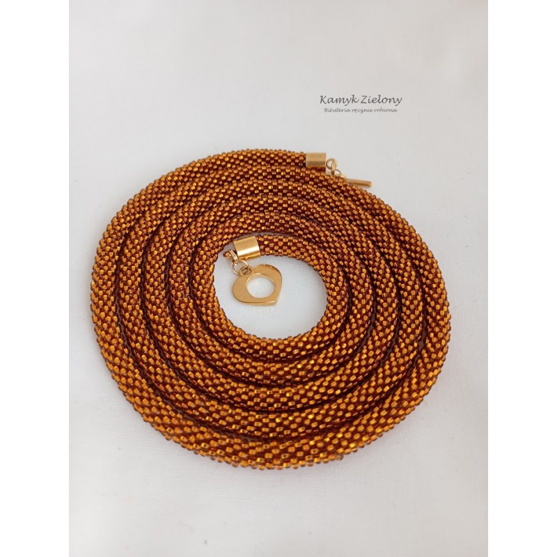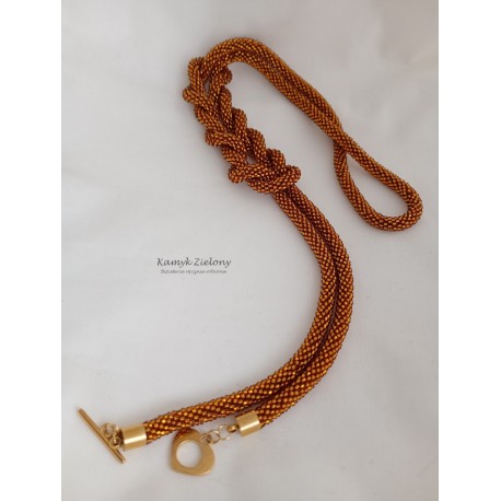 Do jego zrobienia wykorzystano szklane, czeskie koraliki Preciosa w kolorze bursztynowym. Ich wyjątkowość polega na tym, że mają kwadratowe dziurki o srebrzonych środkach - dzięki temu wykonana z nich biżuteria pięknie mieni się w świetle.