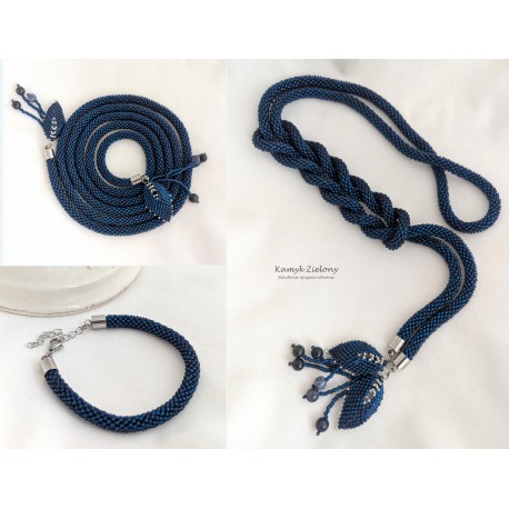 Wykonany został z drobniutkich, szklanych koralików Preciosa w kolorze granatowym. Koraliki użyte do jego wykonania wyróżniają się nietypową budową - mają kwadratowe dziurki, srebrzone w środku, czego oczywiście nie widać na pierwszy rzut oka, ale sprawia to, że wykonana z nich biżuteria ma wyjątkowy połysk.
