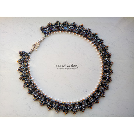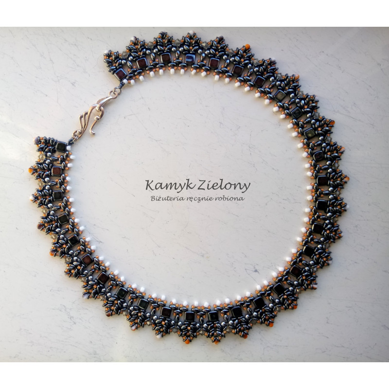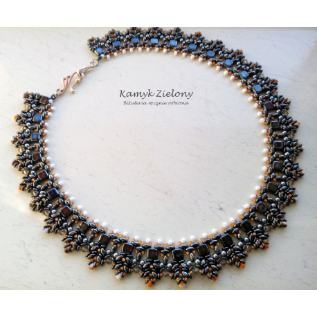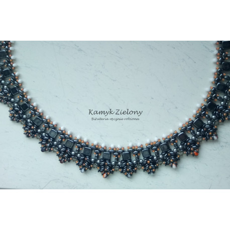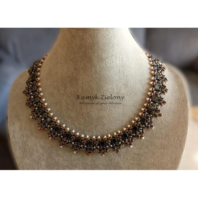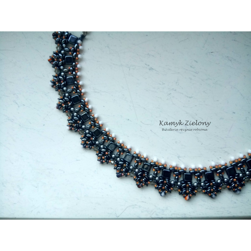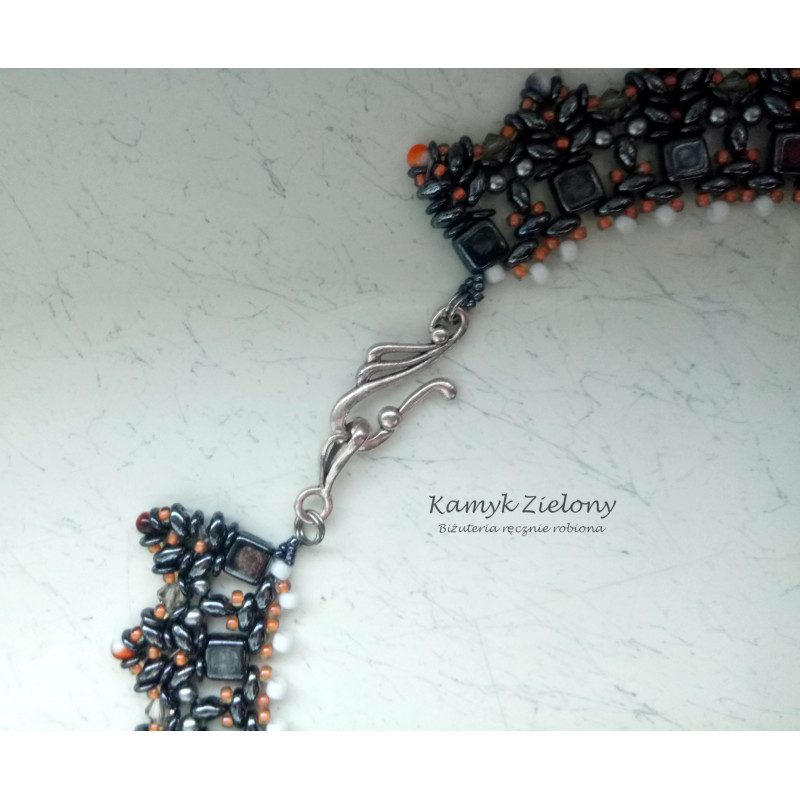 Koralikowy, szeroki naszyjnik wykonany z kilku rodzajów koralików ze szkła, a także z kryształków Bicone oraz szklanych perełek. Utrzymany w kolorystyce szaro-hematytowej, z dodatkiem koloru białego i pomarańczowego.