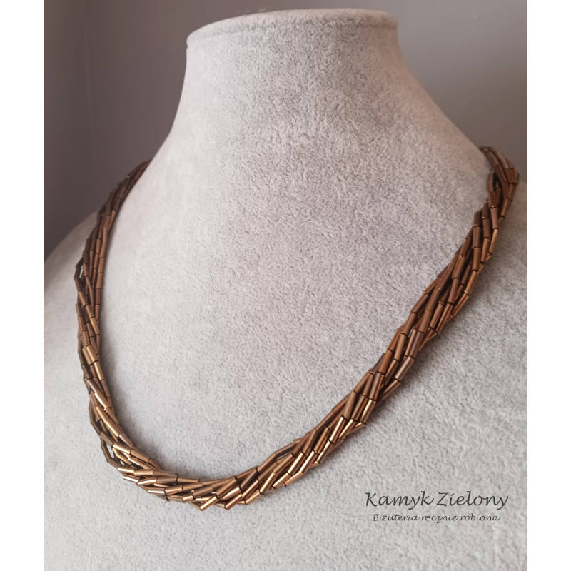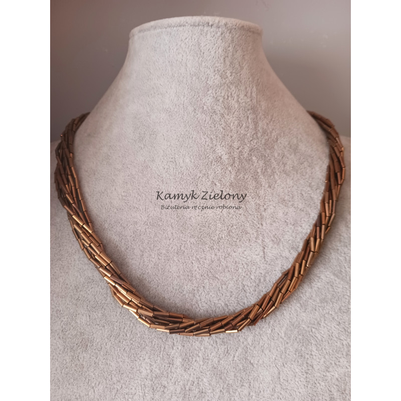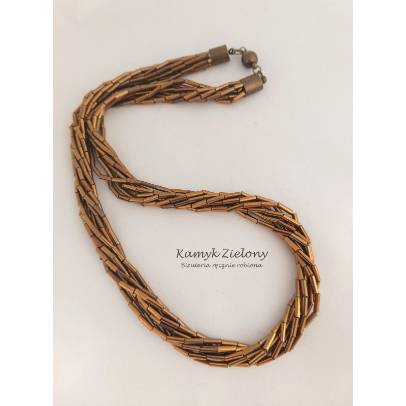 Naszyjnik wypleciony ręcznie z drobnych, szklanych rurek w kolorze brązowo-złotawym, z magnetycznym zapięciem w kształcie kuleczki.