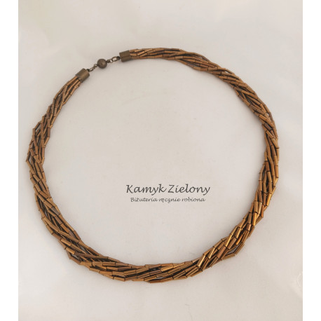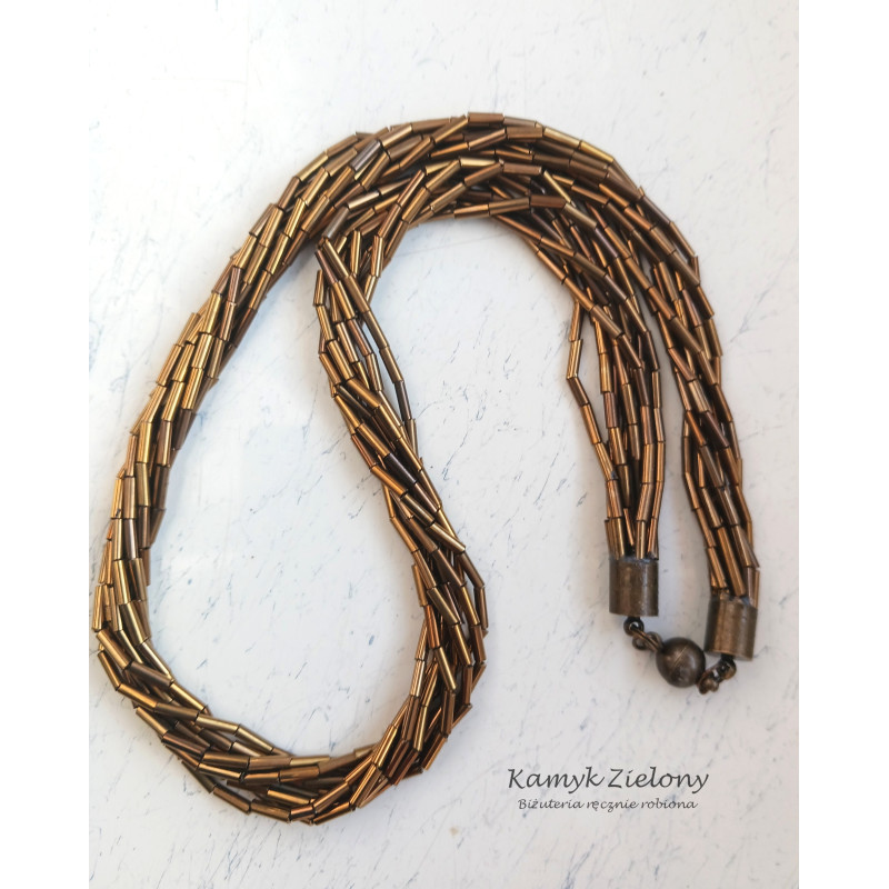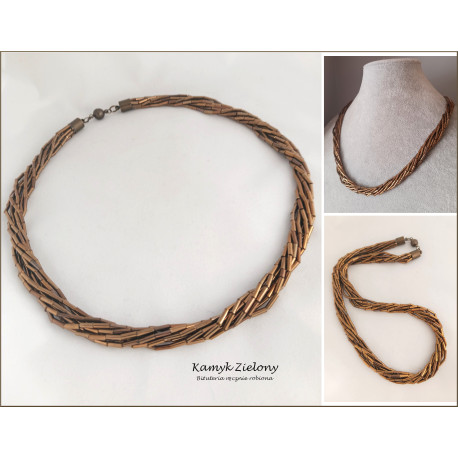 Wykonany ręcznie naszyjnik z brązowo-złotawych szklanych koralików w kształcie rurek