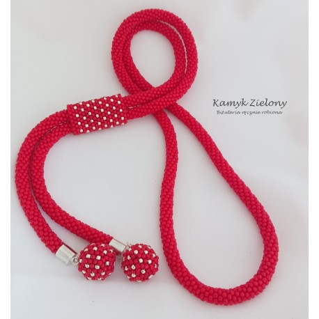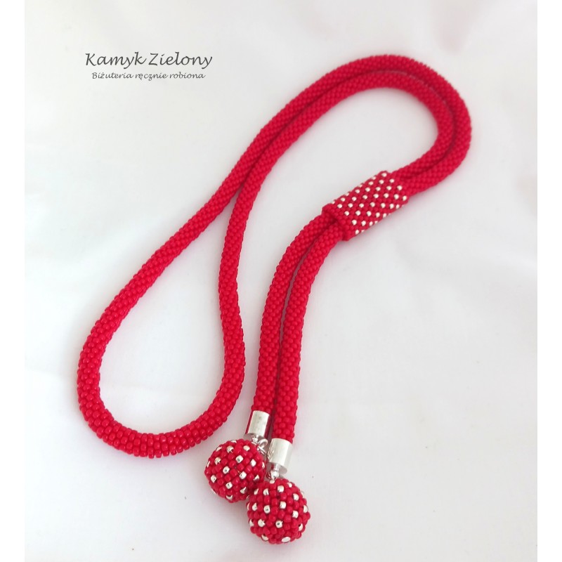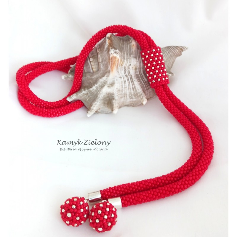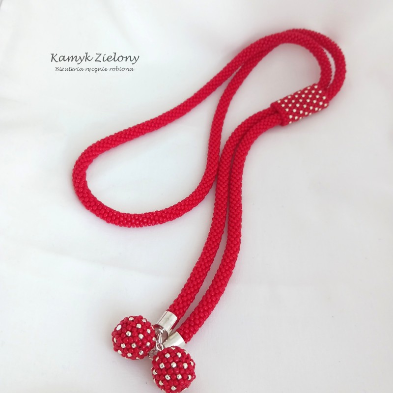 Całość została wykonana ręcznie z wysokiej jakości szklanych koralików Toho w kolorze czerwonym oraz jasnosrebrnym.