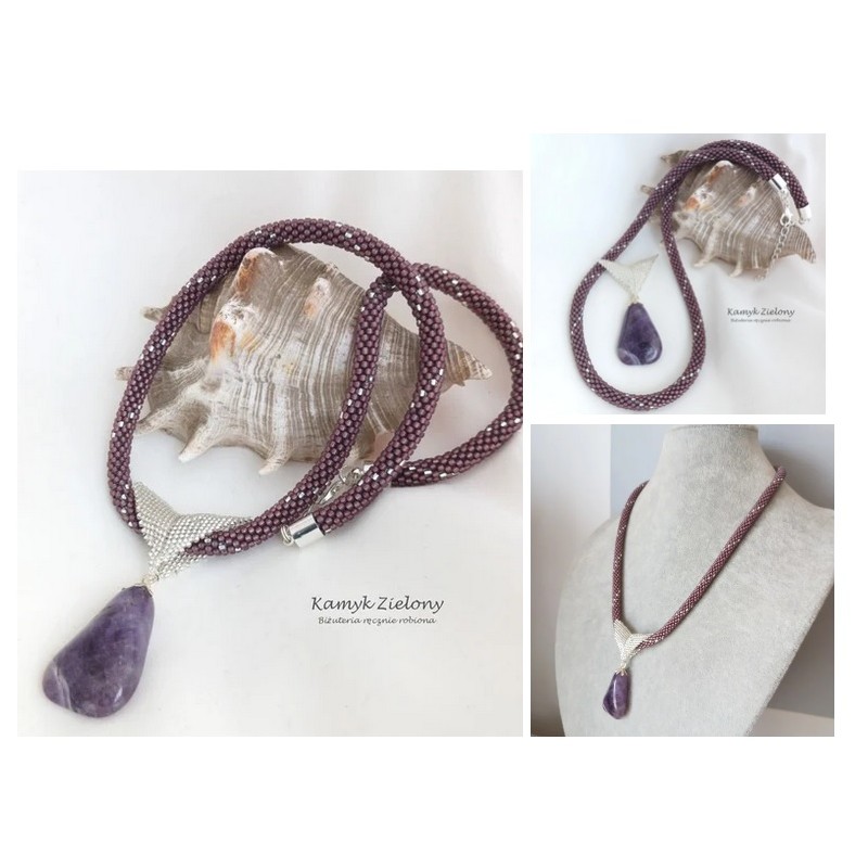 Dodatkową ozdobę naszyjnika stanowi zawieszka wykonana z grudki ametystu, którą zawieszono na krawatce uszytej z drobniutkich koralików Toho. Zawieszkę można zdjąć i naszyjnik nosić bez niej, jako zwykły sznur koralikowy. Zawieszka nadaje się również do noszenia na łańcuszku.