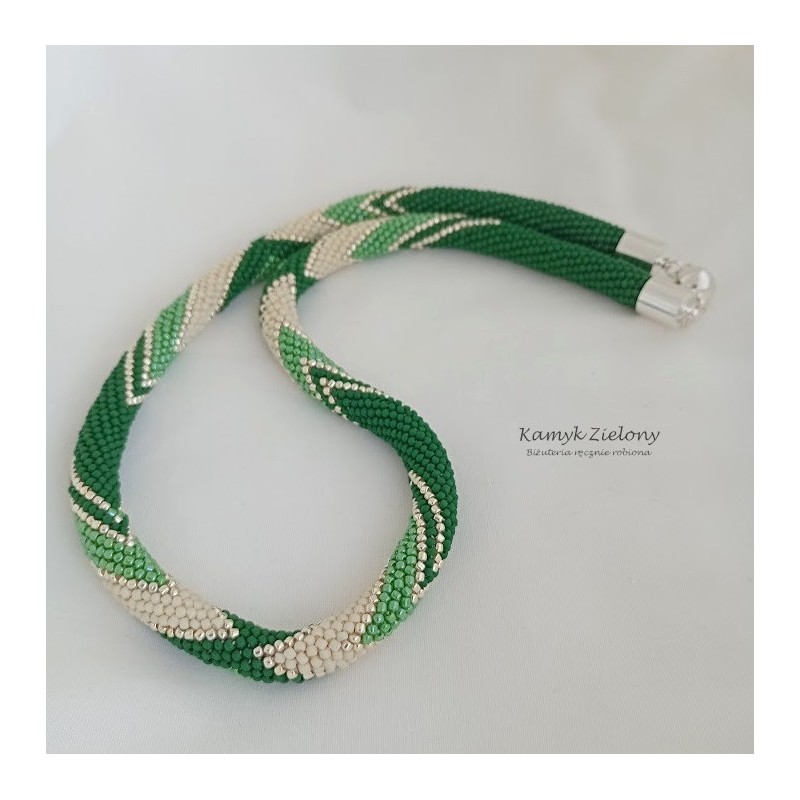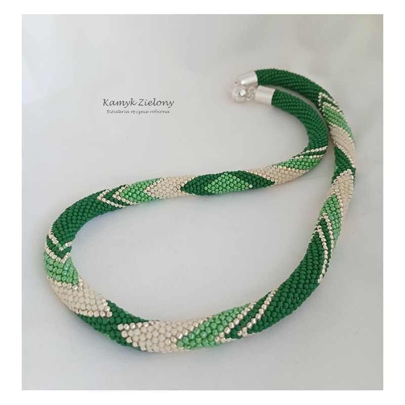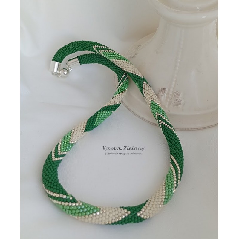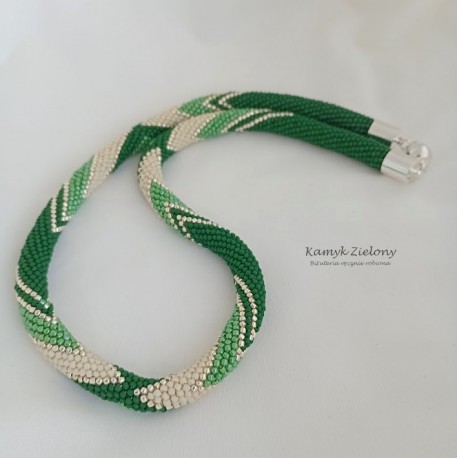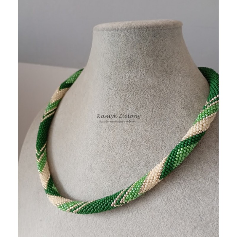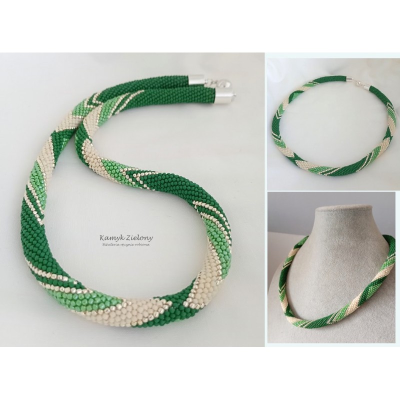 Naszyjnik z japońskich, szklanych koralików Toho, utrzymany w zielono-beżowej kolorystyce.