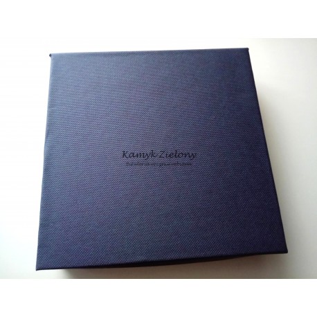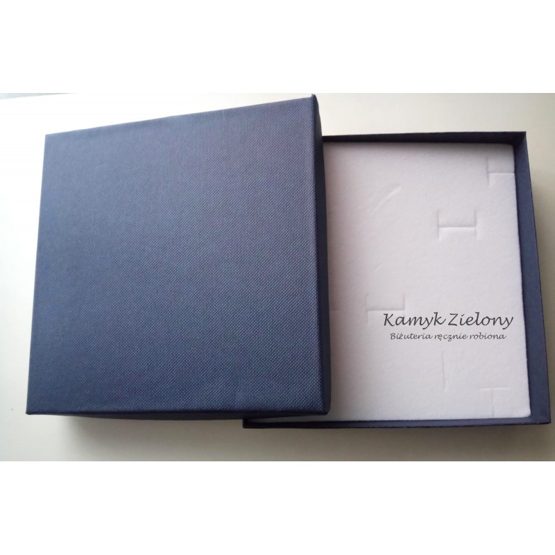 Ozdobne, duże pudełko na komplet biżuterii. Wykonane z kartonu z teksturą płótna lnianego. Wkładka z gąbki pokrytej białym welurem. Rozmiar pudełka ok. 150x150x32 mm.
