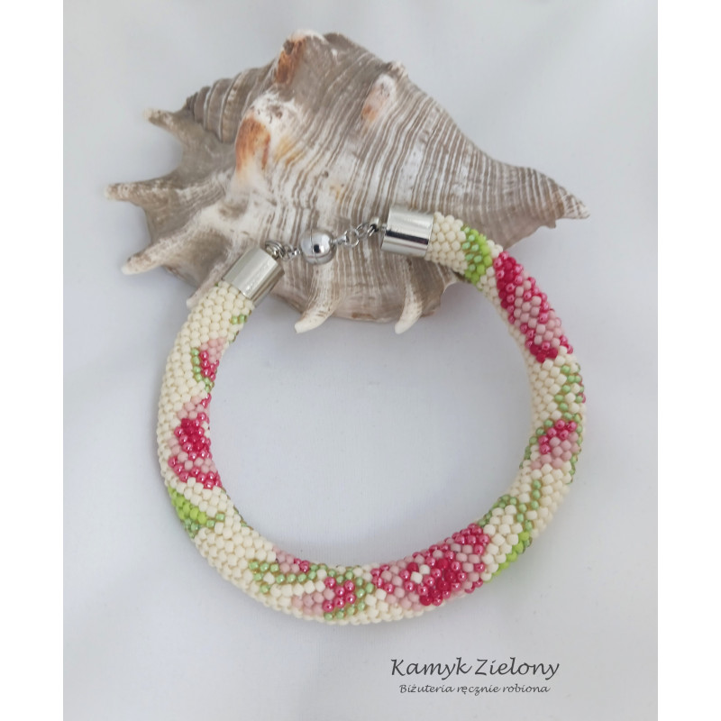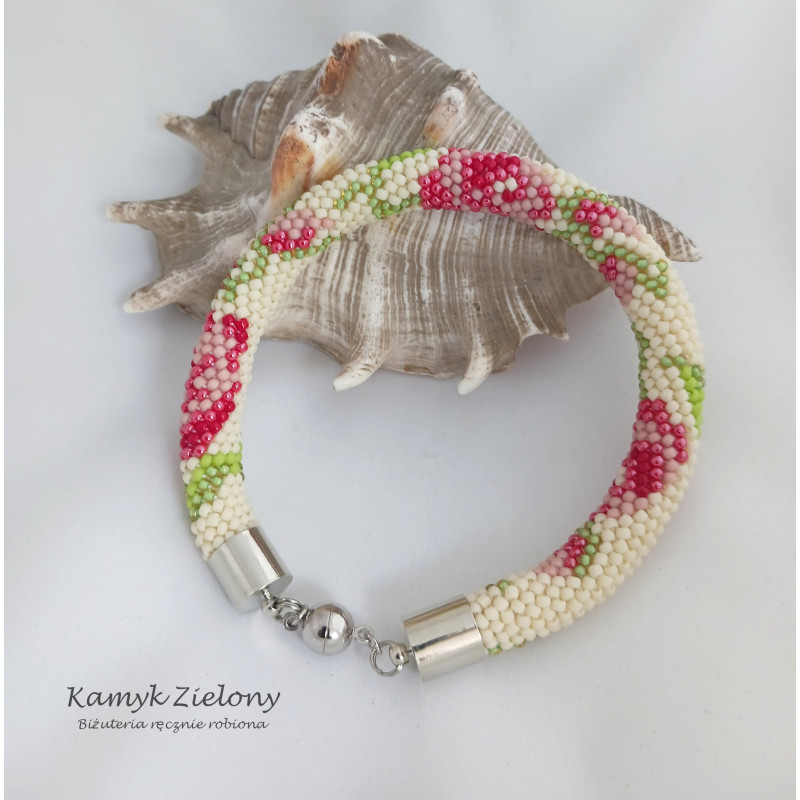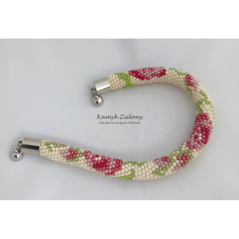 Bransoletka z wzorkiem w różyczki wykonana ręcznie ze szklanych, japońskich koralików Toho.